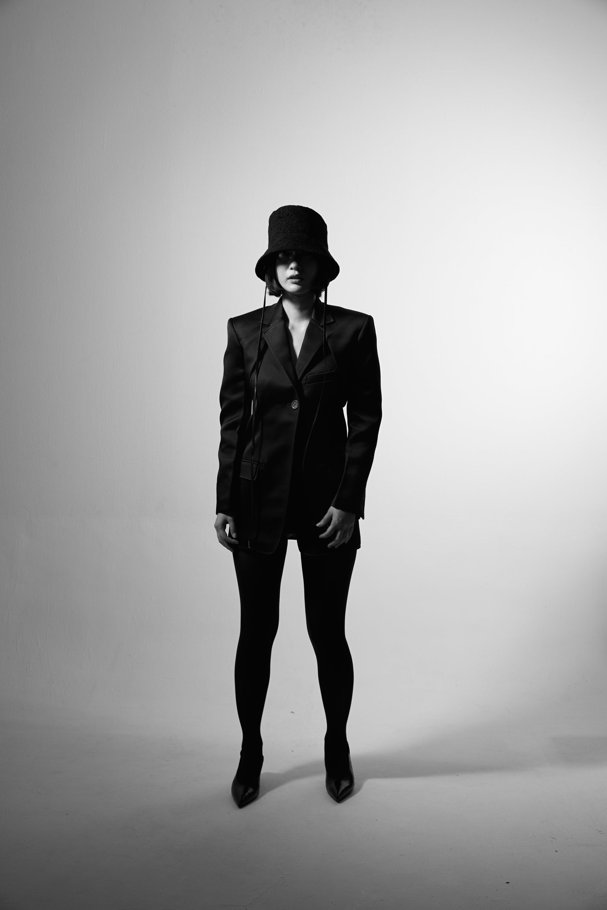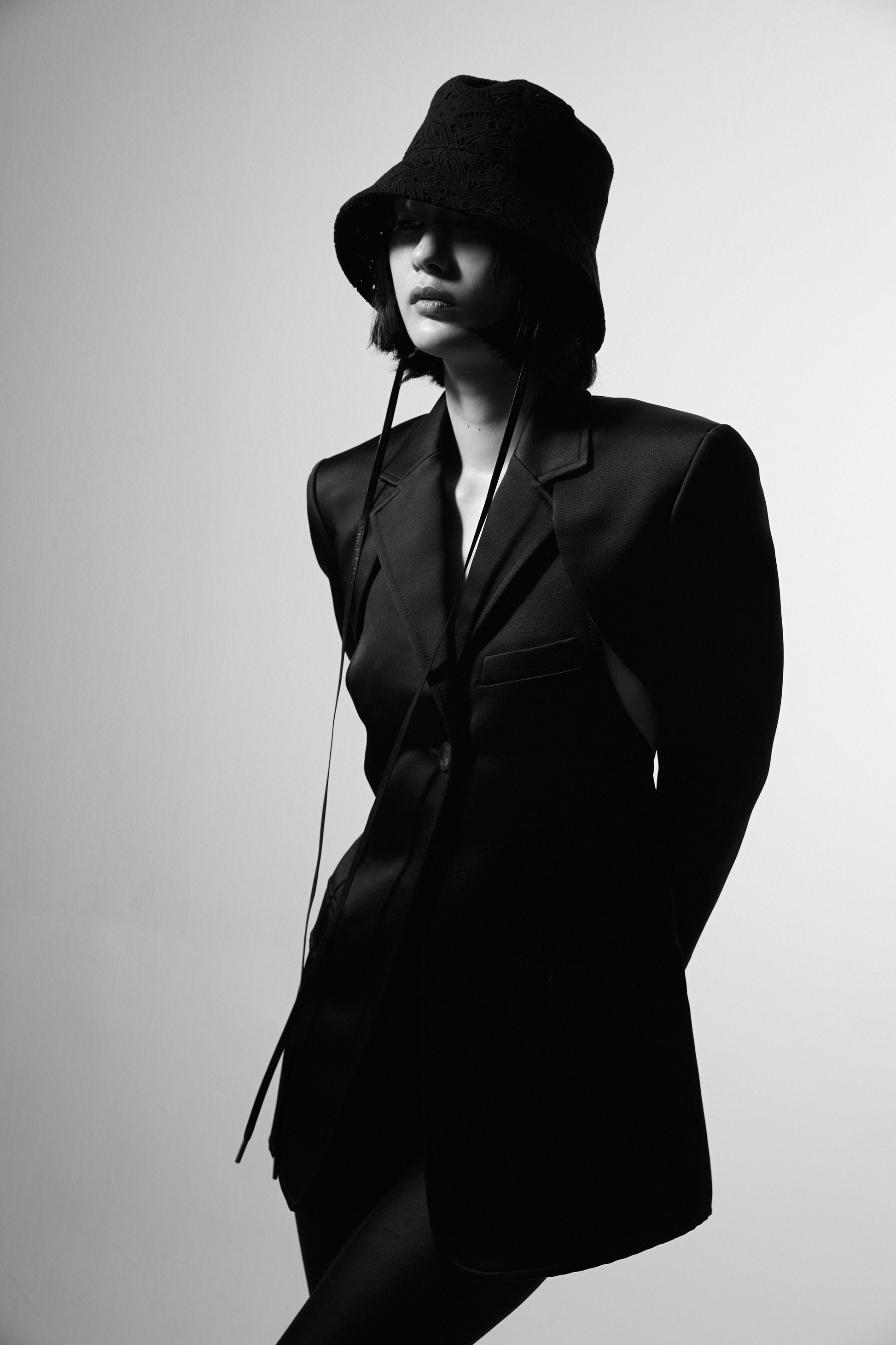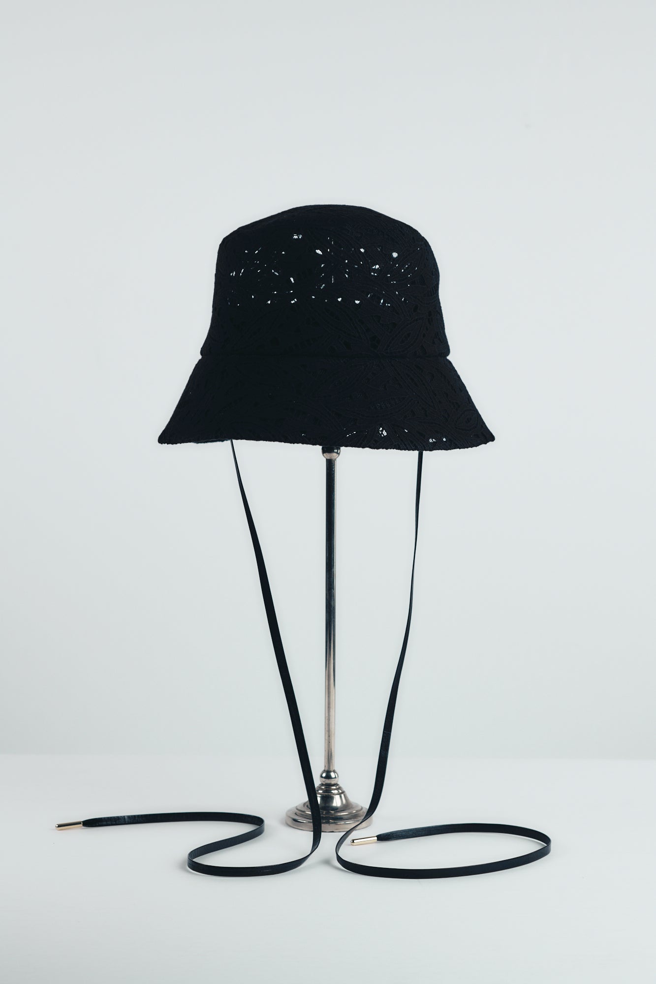 幾何学模様を彷彿とさせるリーフ柄のオリジナルレース生地を使用し、バケットハットに落とし込んだ一品。繊細なレースの美しさと、構築的で美しいフォルムが調和し、大人の装いにふさわしいラグジュアリーな印象に仕上げました。甘くなりがちなレース素材も、取り外し可能なレザーコードが程よく引き締め、洗練されたムードを演出します。