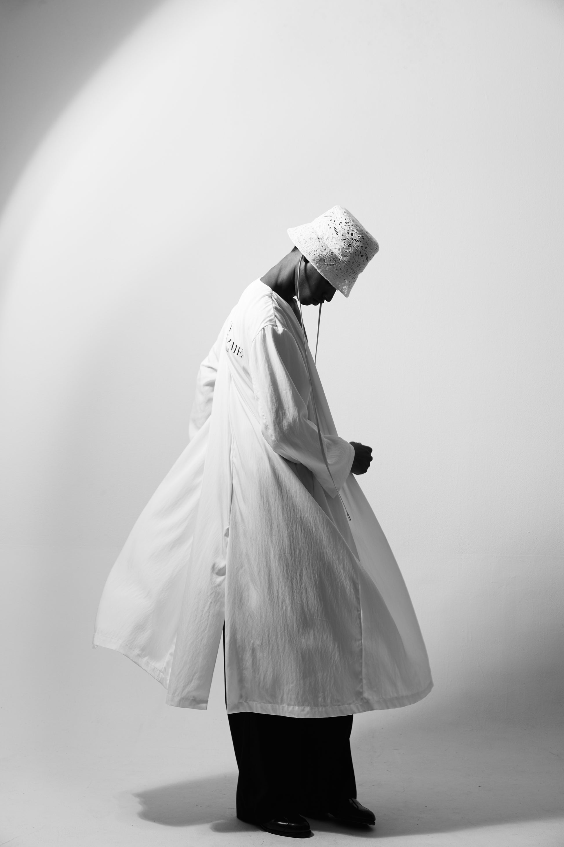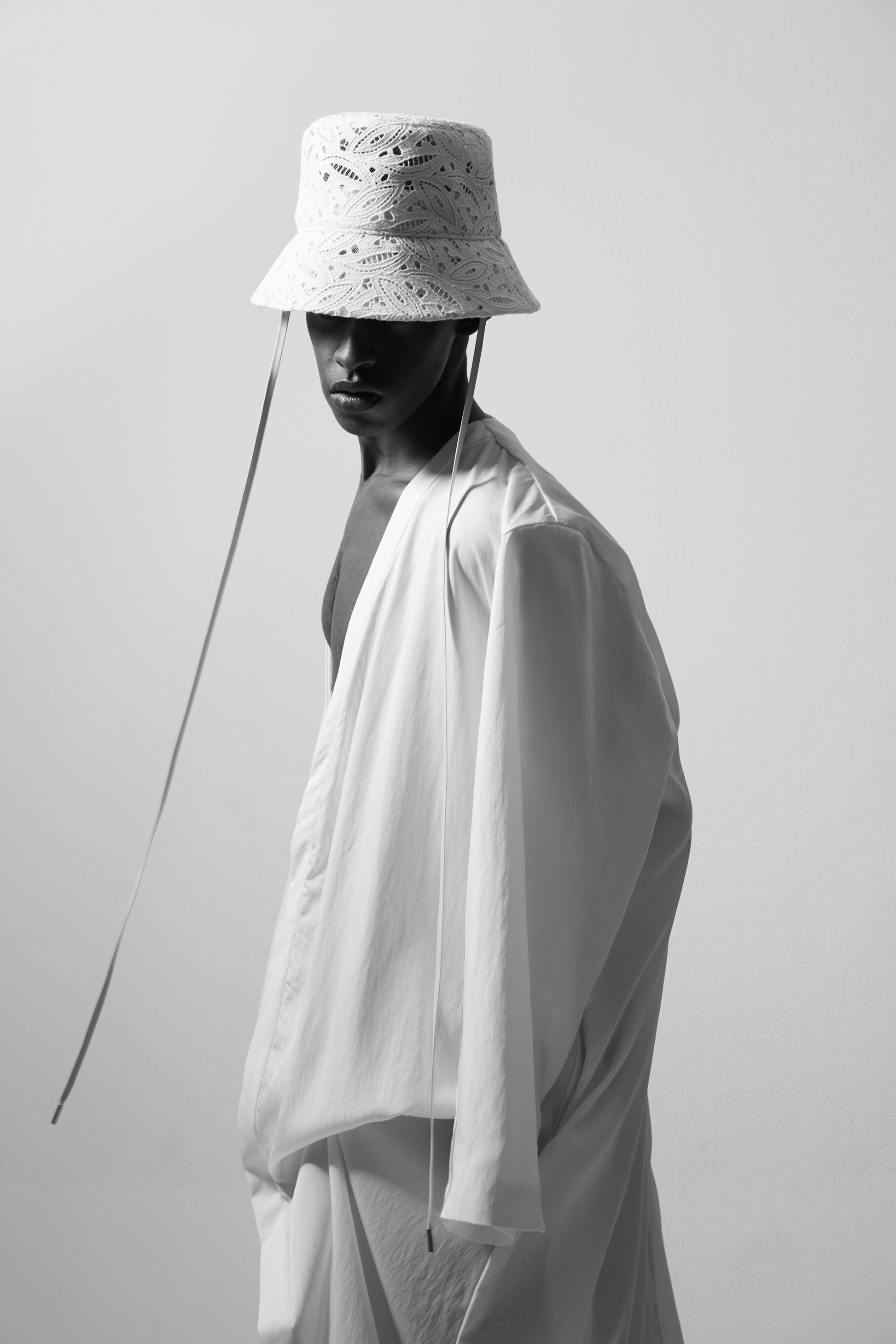幾何学模様を彷彿とさせるリーフ柄のオリジナルレース生地を使用し、バケットハットに落とし込んだ一品。繊細なレースの美しさと、構築的で美しいフォルムが調和し、大人の装いにふさわしいラグジュアリーな印象に仕上げました。甘くなりがちなレース素材も、取り外し可能なレザーコードが程よく引き締め、洗練されたムードを演出します。