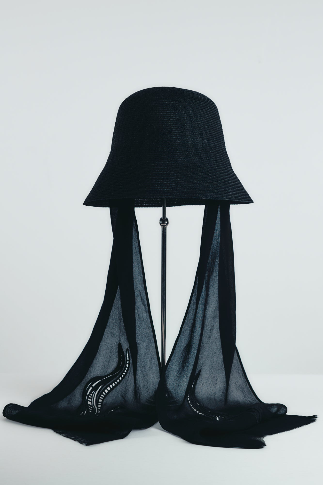 繊維で細くしなやかなマニラ麻ブレード素材を活かしたミニマルなフォルムにバテンレースの様な刺繍を施したリボンで軽やかに仕上げている。リボンは取り外してスカーフとしても使用可能。