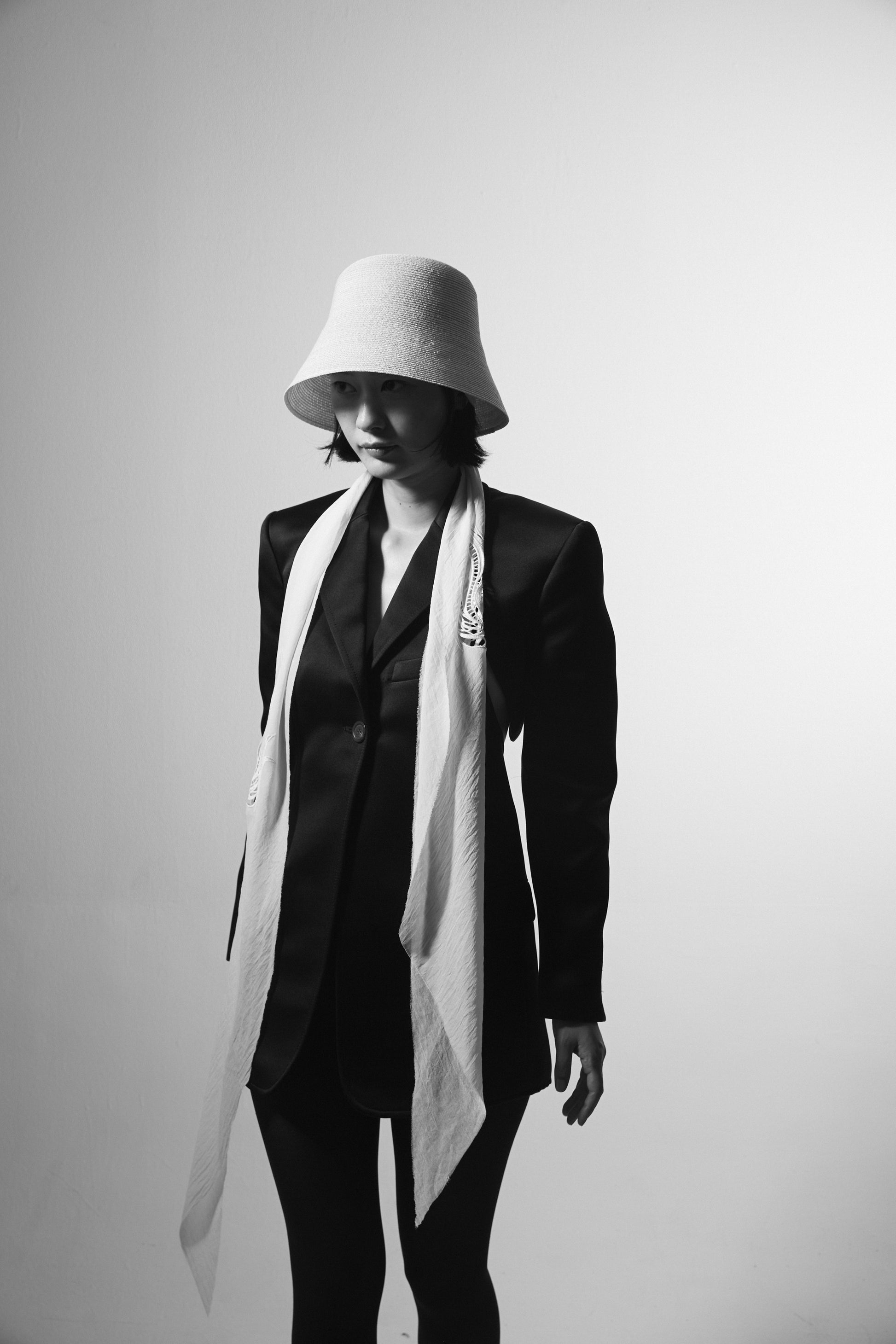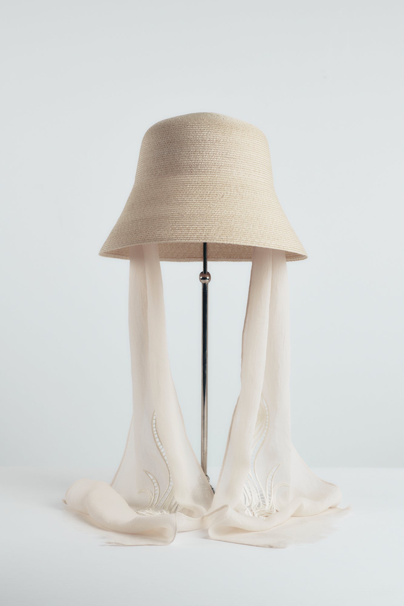 繊維で細くしなやかなマニラ麻ブレード素材を活かしたミニマルなフォルムにバテンレースの様な刺繍を施したリボンで軽やかに仕上げている。リボンは取り外してスカーフとしても使用可能。