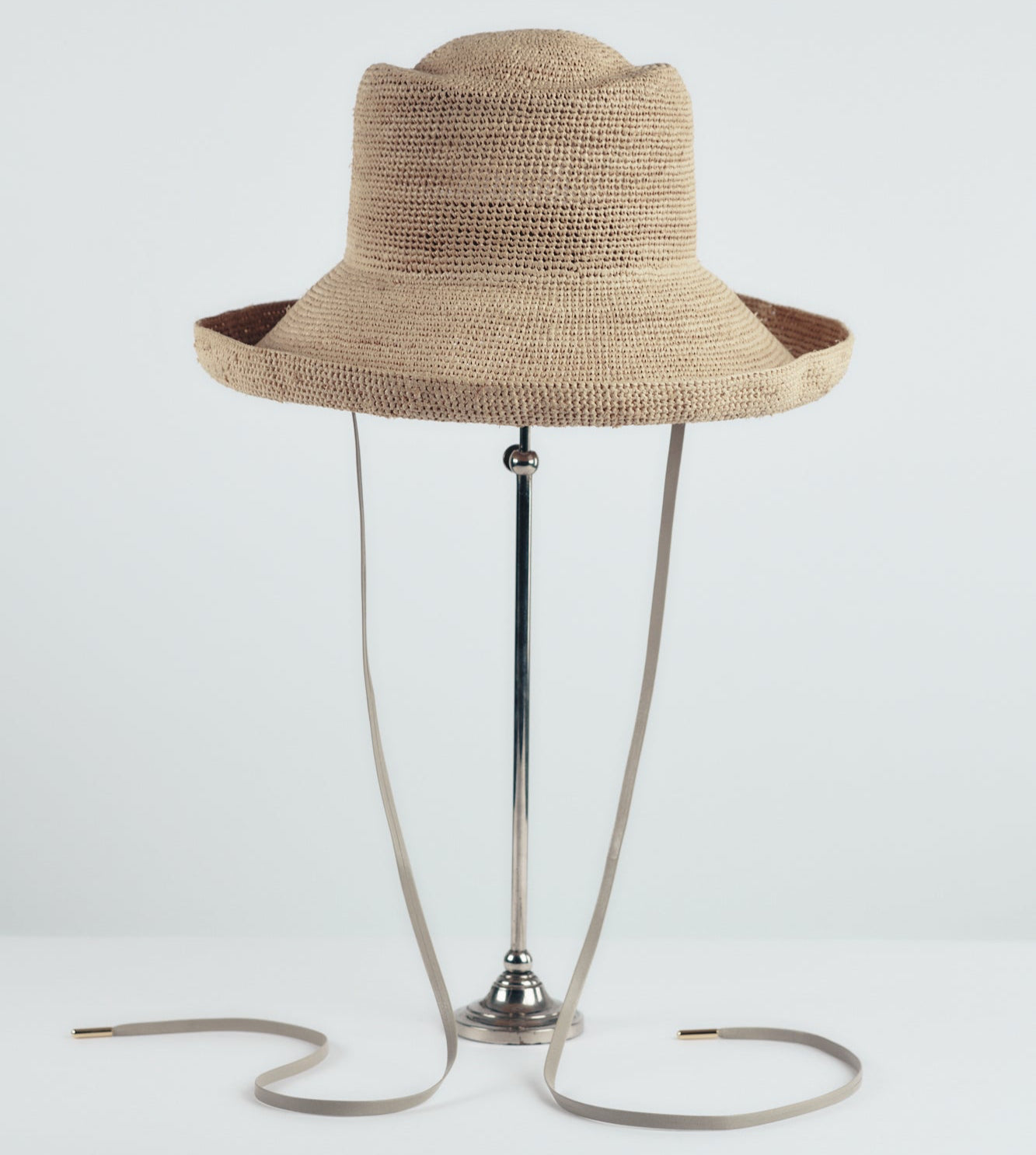 定番でお作りしているラフィア素材のクロッシェ帽子をリニューアル。 一つ一つ丁寧に手編みされたラフィアの素材はより細かく繊細な繊維を選定。 100年以上前のアンティークのフォルムを活 かしたシンプルかつモダンなデザインに落とし込み、 カジュアルすぎず、モードにも被れる大人の女性に向けたハットになっている。 附属の巾着に入れて、クルッと丸めて持ち歩き可能。保管の際は形を整えて通気性の良い場所で保管。レザーのドローコードは取り外し可能。*ESSENTIAL LINE
