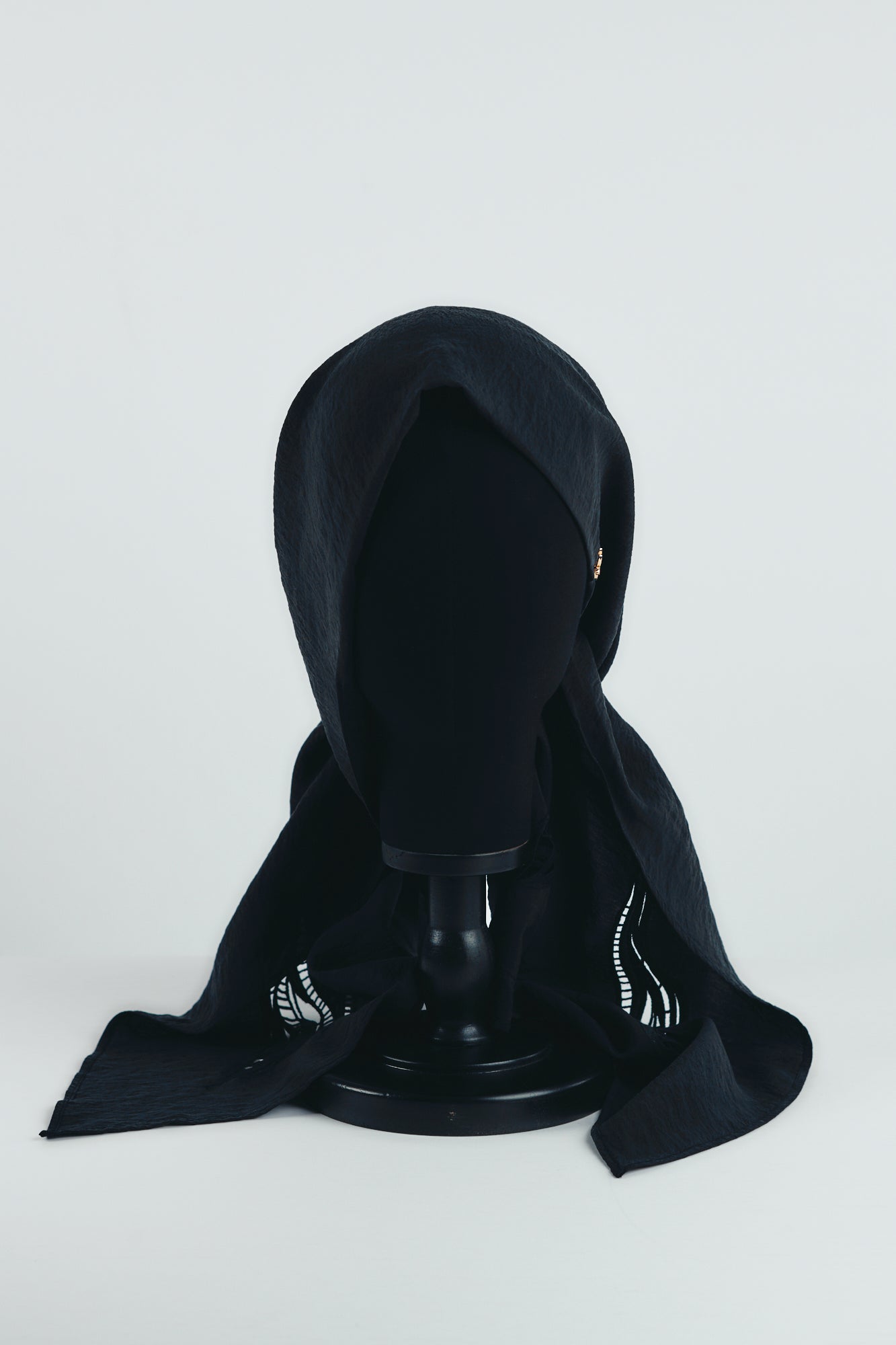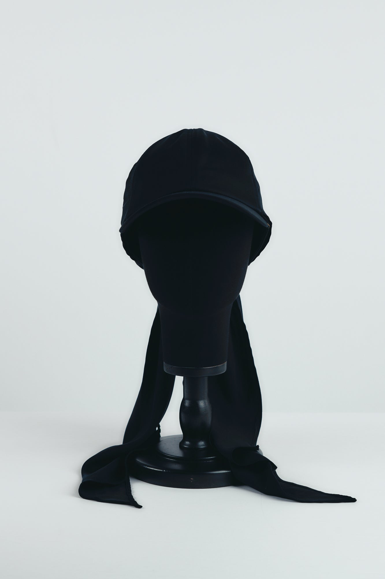 クラシカルなイメージのターバンフードはバテンレースをイメージした刺繍を施している。ダーツでやや立体的に仕上げ、