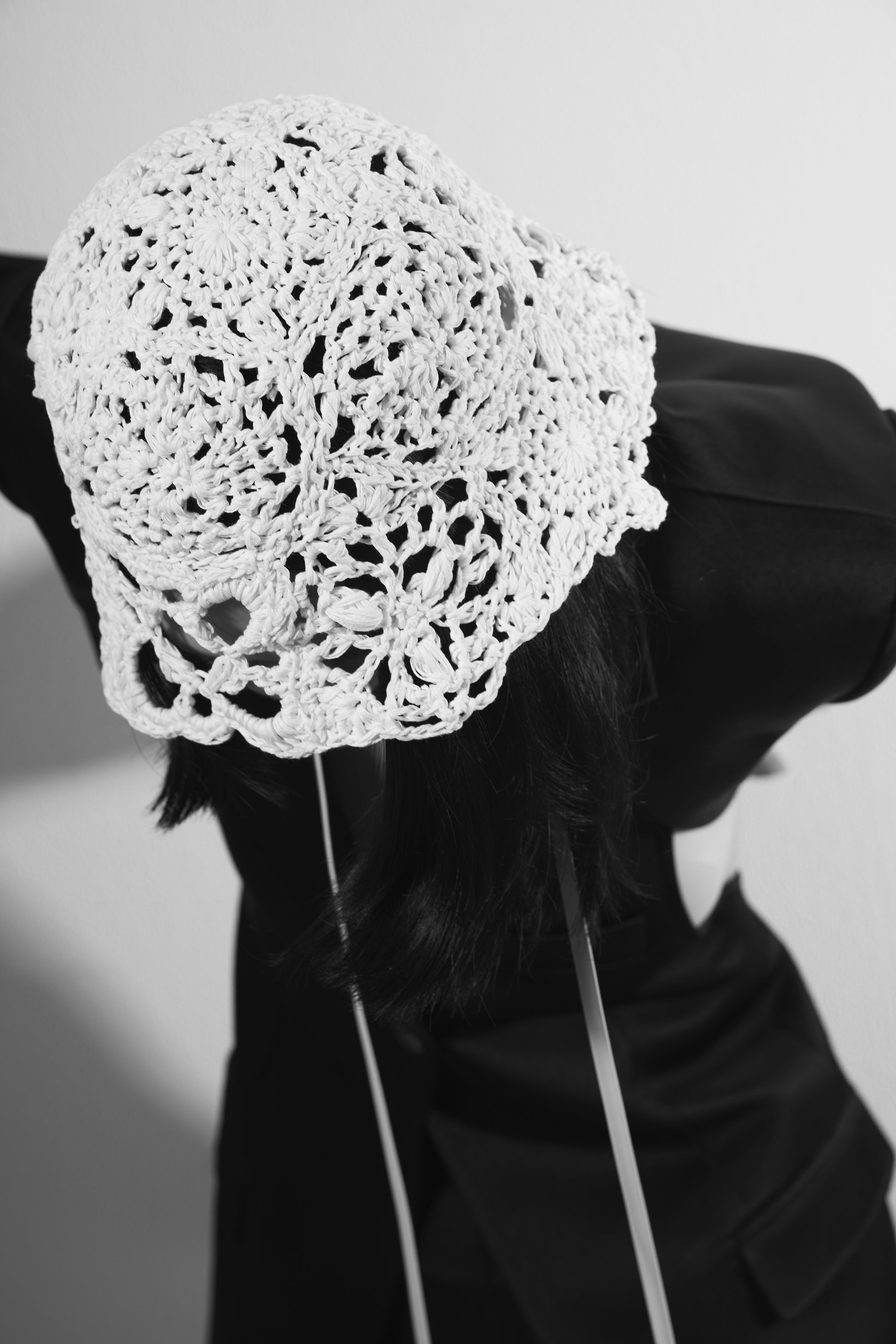 レース編みのモチーフをパッチワークし、立体的に仕立てたハット。可憐な表情を持ちながらも、ギマ糸を用いることで甘くなりすぎず、モードな印象に昇華されています。付属のレザーコードは取り外し可能で、スタイリングに応じたアレンジも楽しめます。甘さと洗練を併せ持つデザインは、大人の方にこそおすすめしたい一点です。