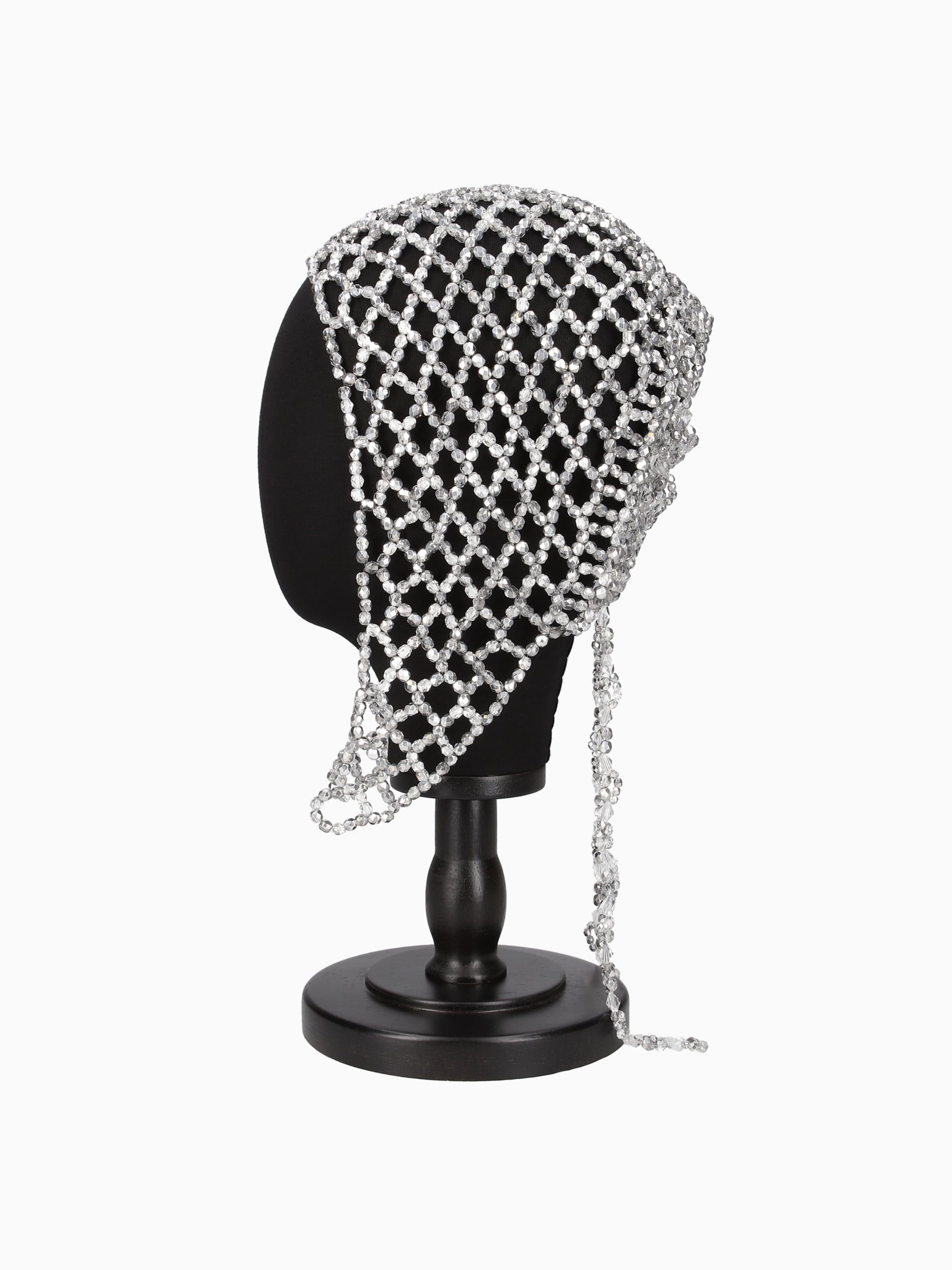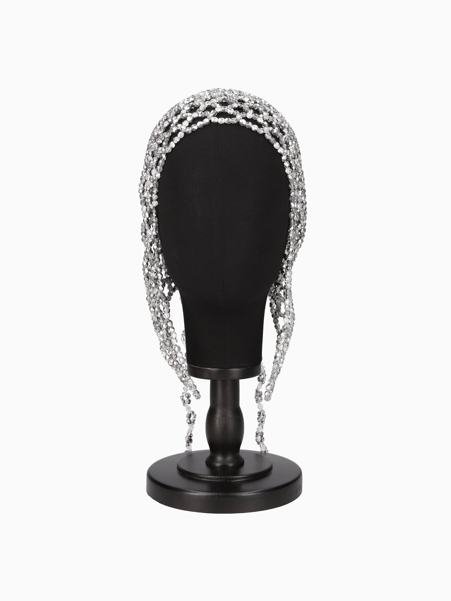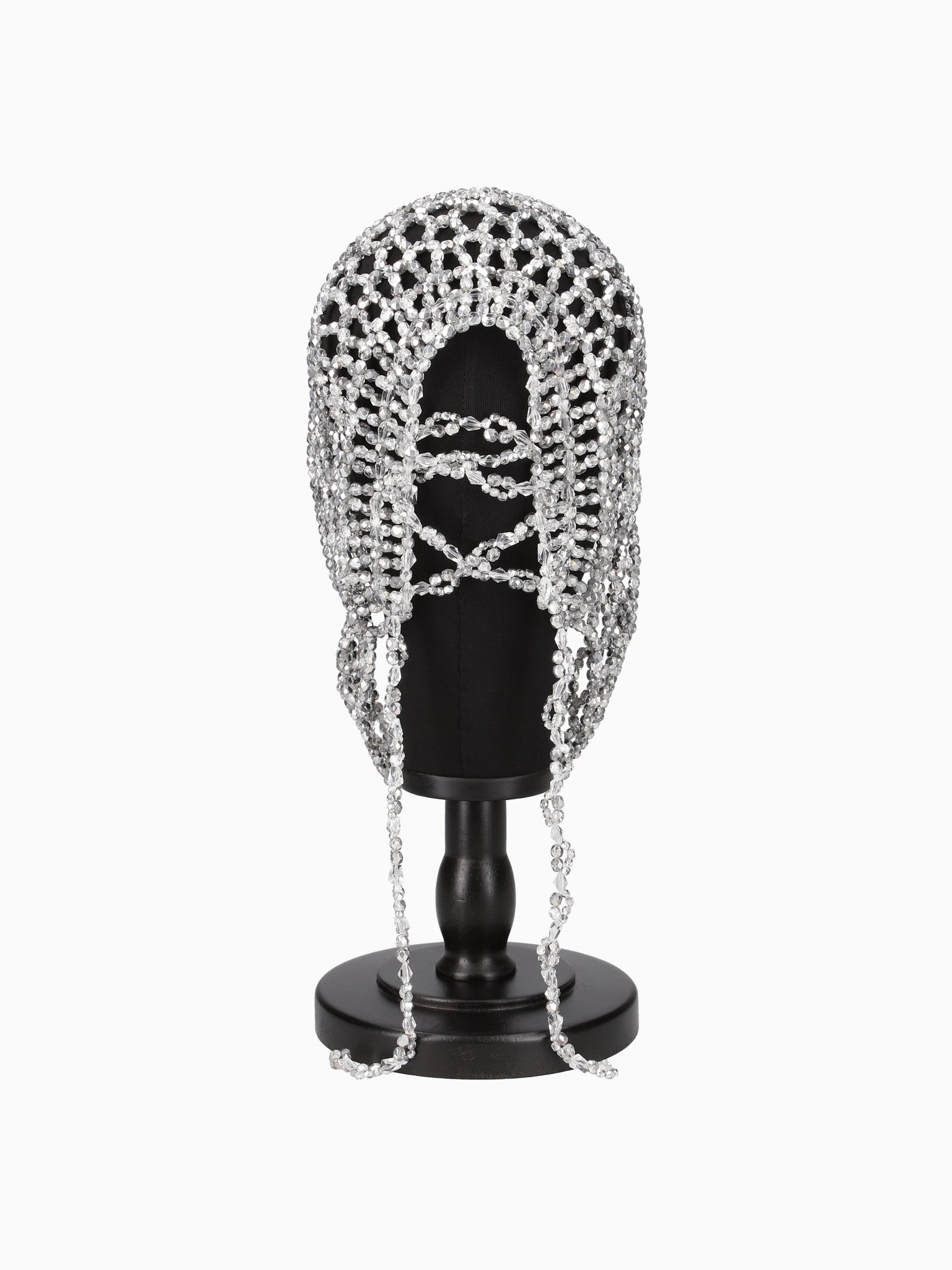 キュビズムを連想する多角形のチェコ製のビジューを使用し、菱形で構成された球のフォルムを立体で作りました。ビーズのリボンで頭にフィットさせるデザインになっています。リボンはサイドで垂らしたり様々なアレンジが可能です。一つ一つ手作業で作り上げる受注生産になります。購入希望の際はインフォメーションまでご連絡下さい。