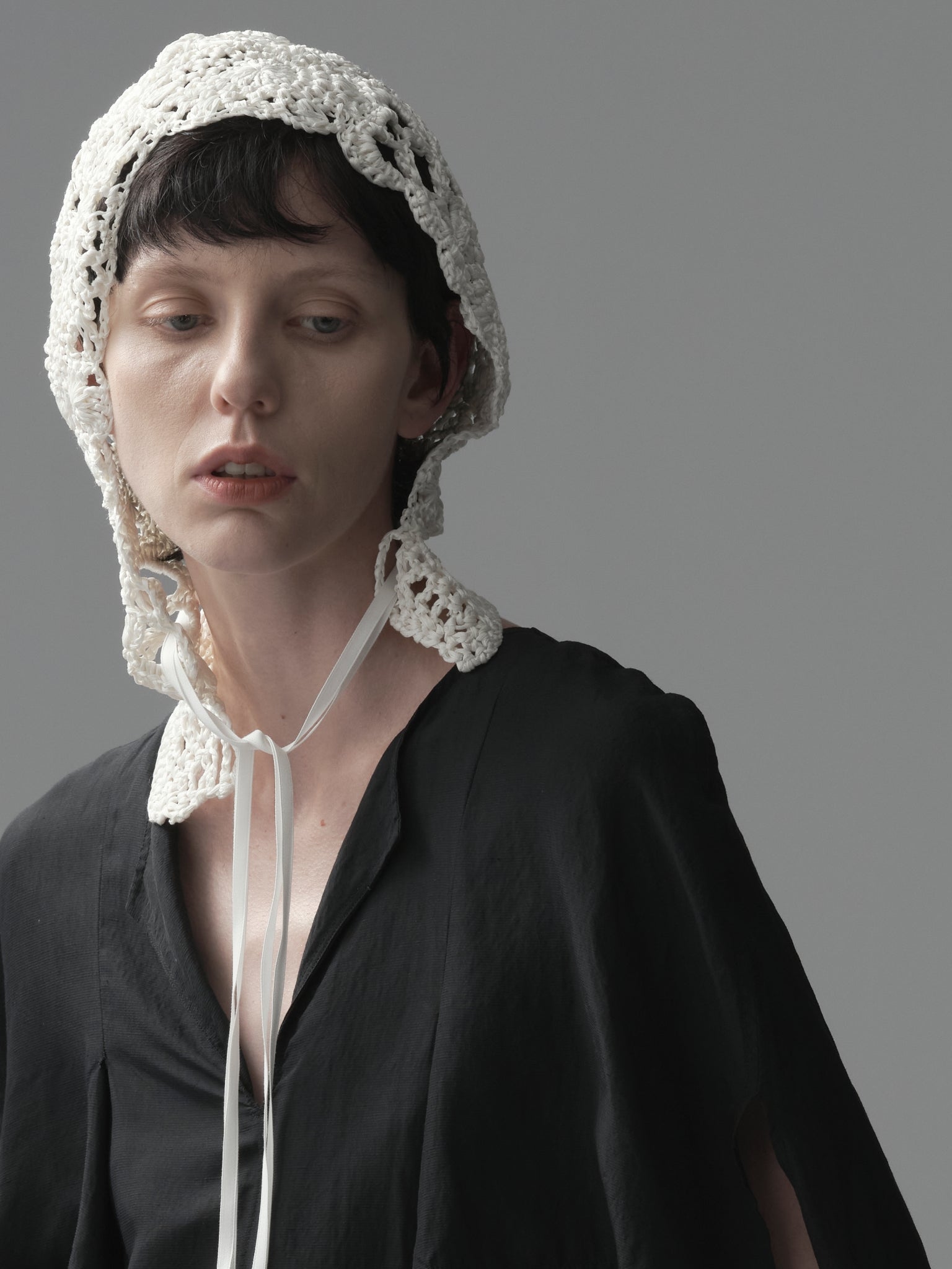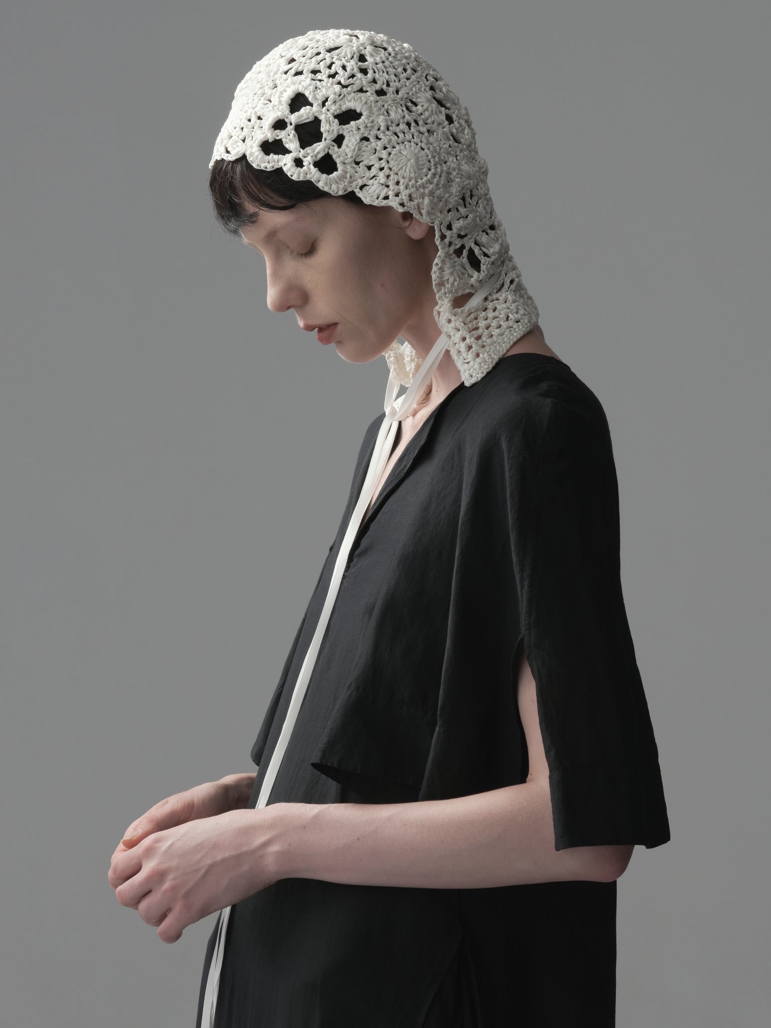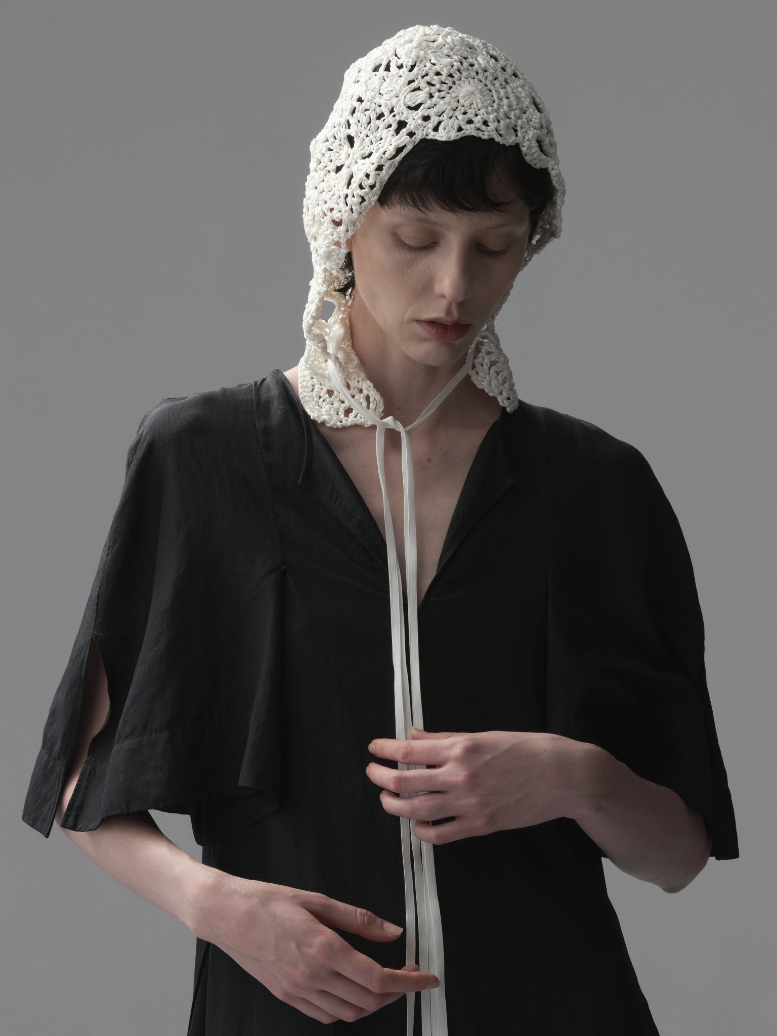 Silk100%のレース編みモチーフを一つ一つハンドメイドで繋ぎあわせたクチュールメイドのフード。 今期はより繊細な糸を使用し、シルクの上品な光沢感がピュアなイメージのレースを大人の雰囲気に仕上げています。 ジョーゼットのドローコードは取り外し可能です。