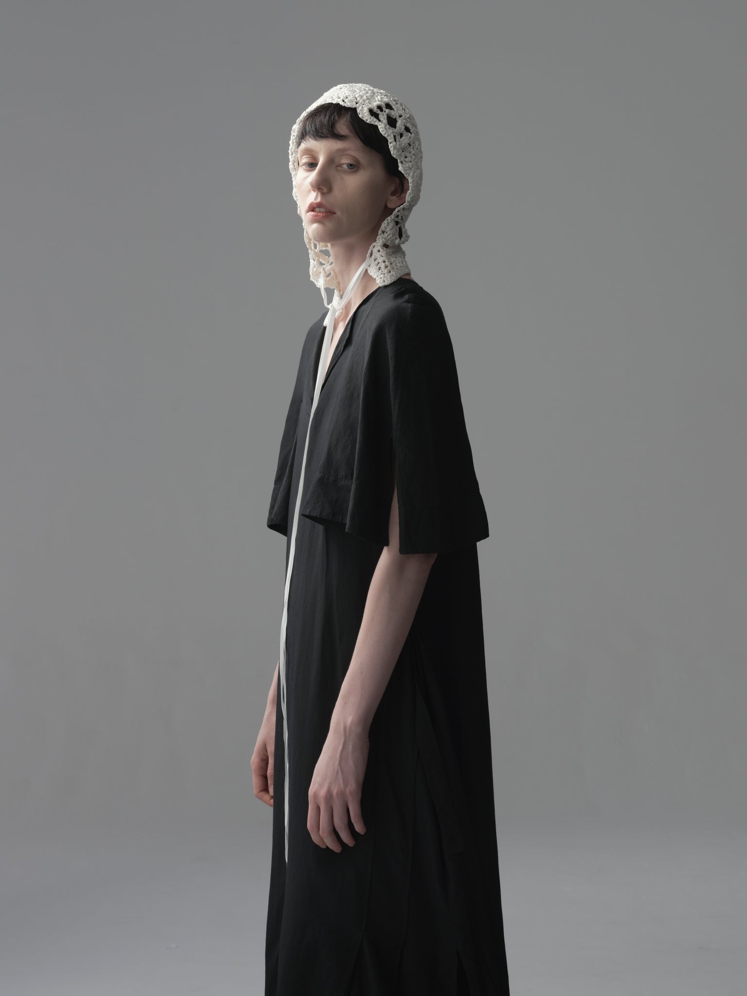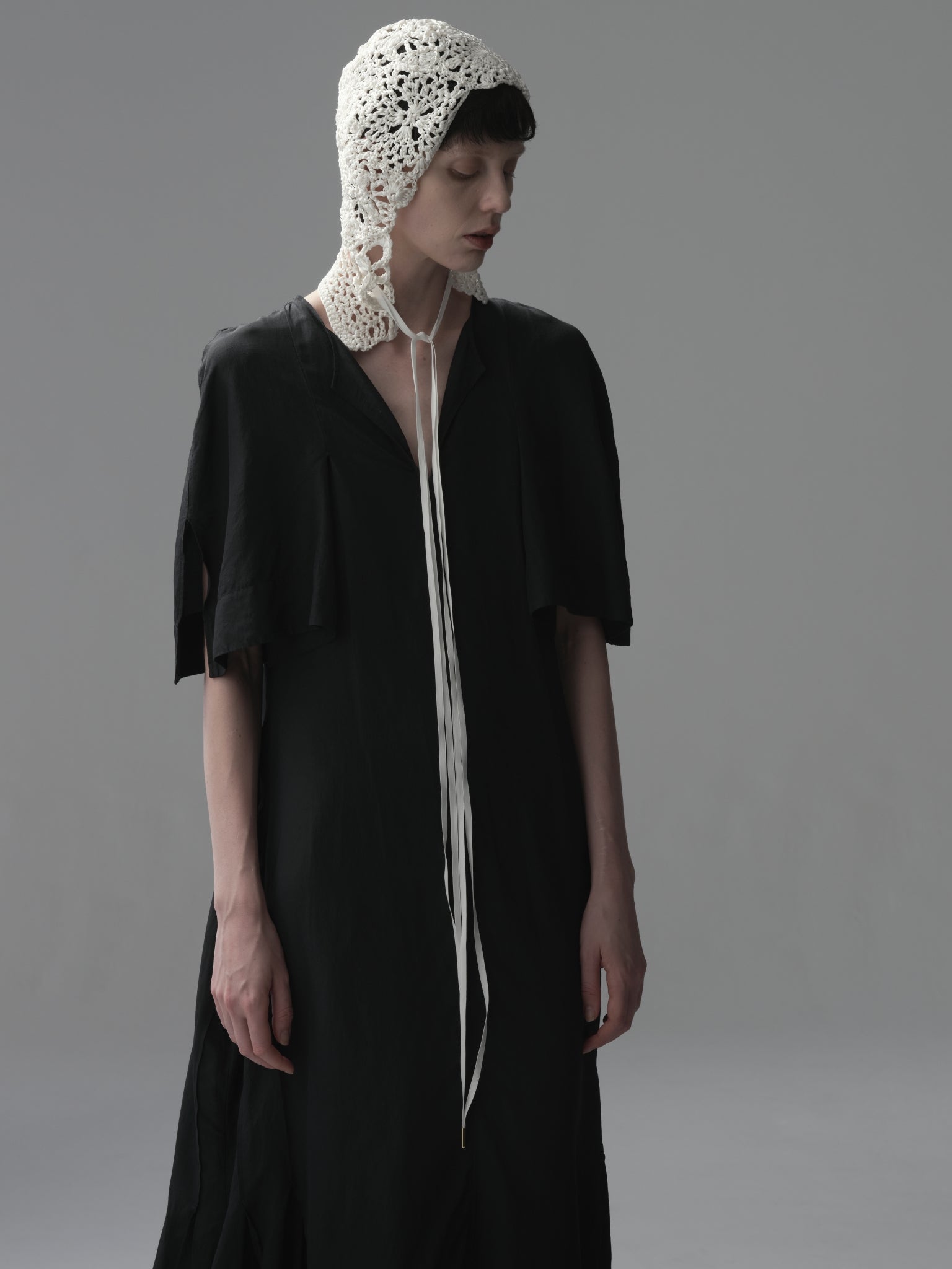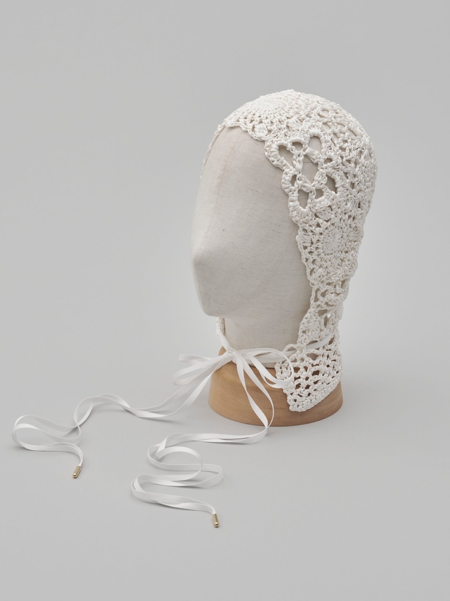 Silk100%のレース編みモチーフを一つ一つハンドメイドで繋ぎあわせたクチュールメイドのフード。 今期はより繊細な糸を使用し、シルクの上品な光沢感がピュアなイメージのレースを大人の雰囲気に仕上げています。 ジョーゼットのドローコードは取り外し可能です。