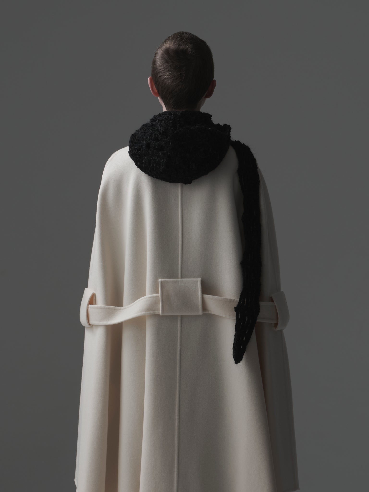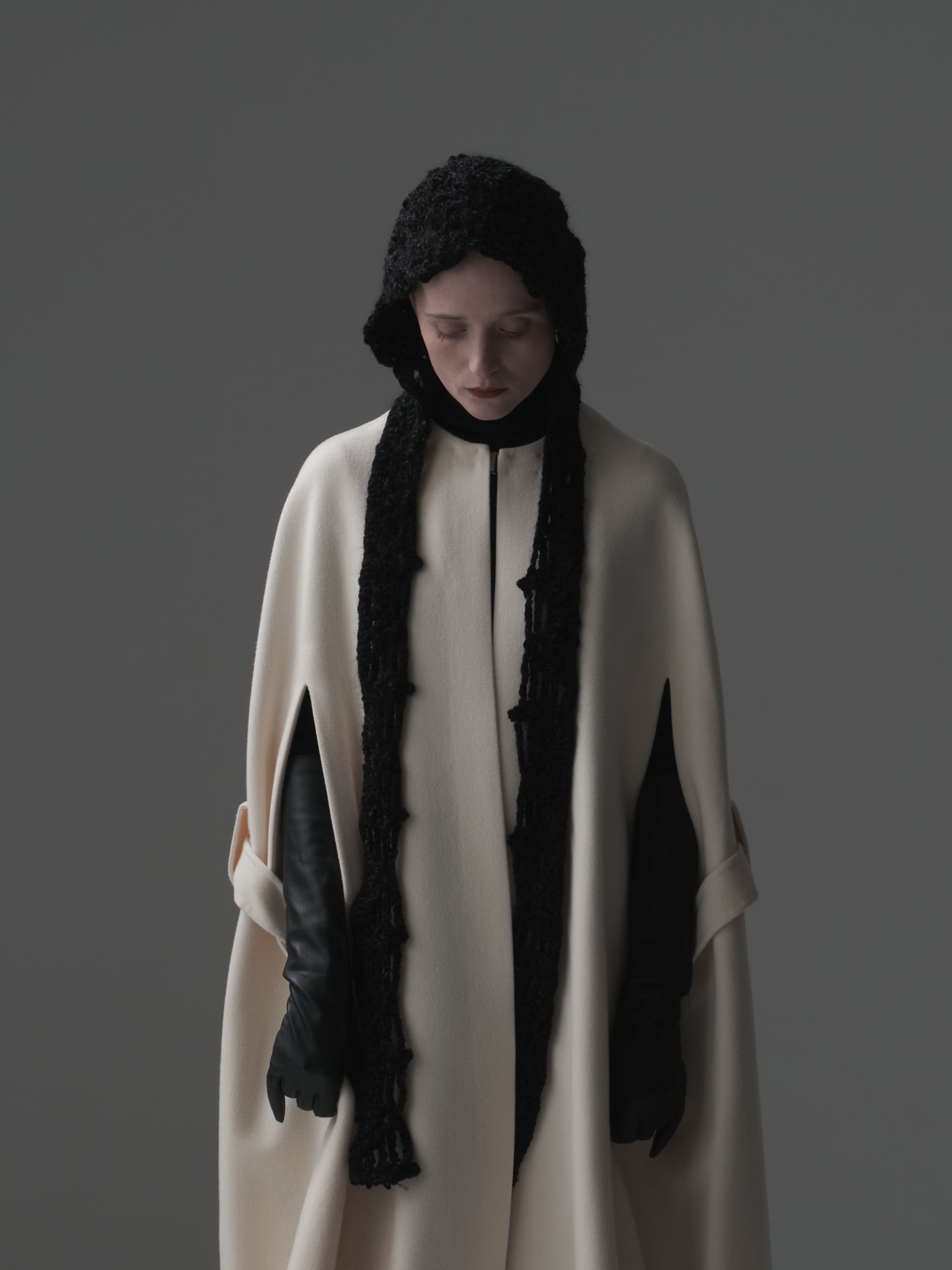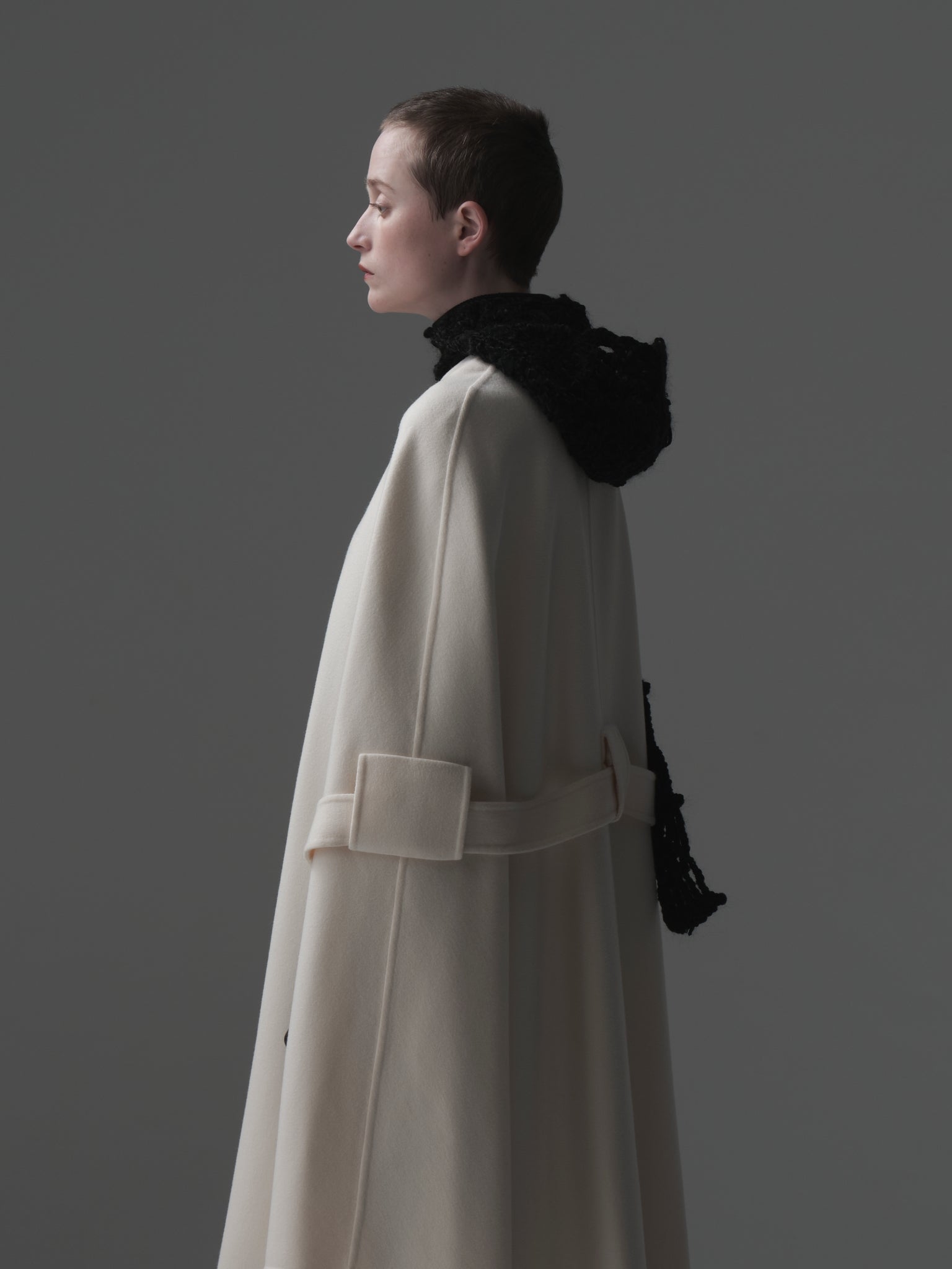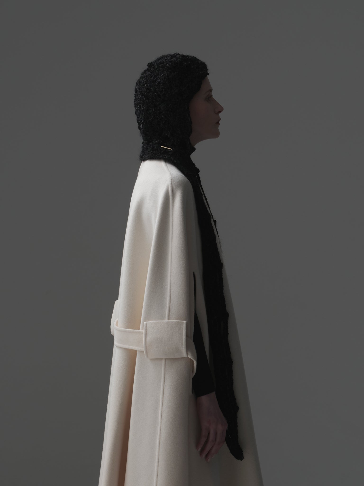 4つのカギ編みモチーフを⼀つ⼀つハンドメイドで繋ぎあわせる事でフォルムを作る、Alexandraシリーズ。今季はモール⽷を使って⽴体感のあるフォルムとボリュームを出しました。モール⽷とモヘアが上品な光沢感とボリューム感を。モチーフの柄が絶妙なバランスを⽣み出しています。