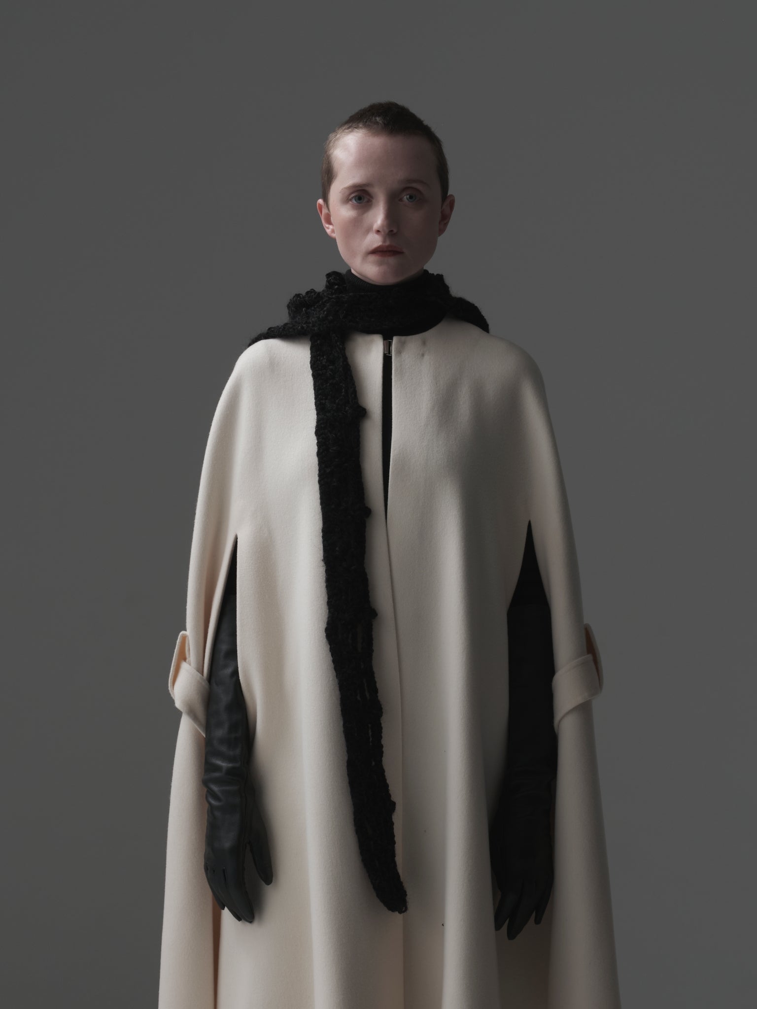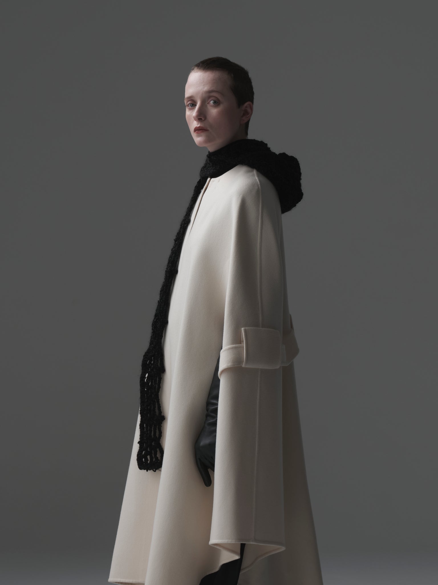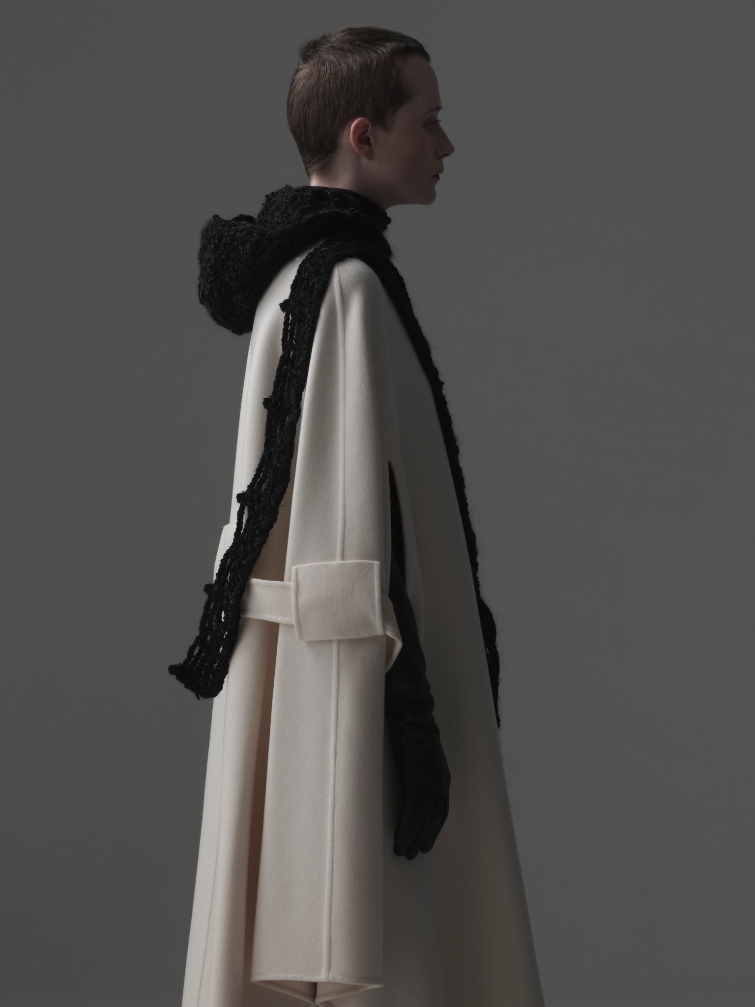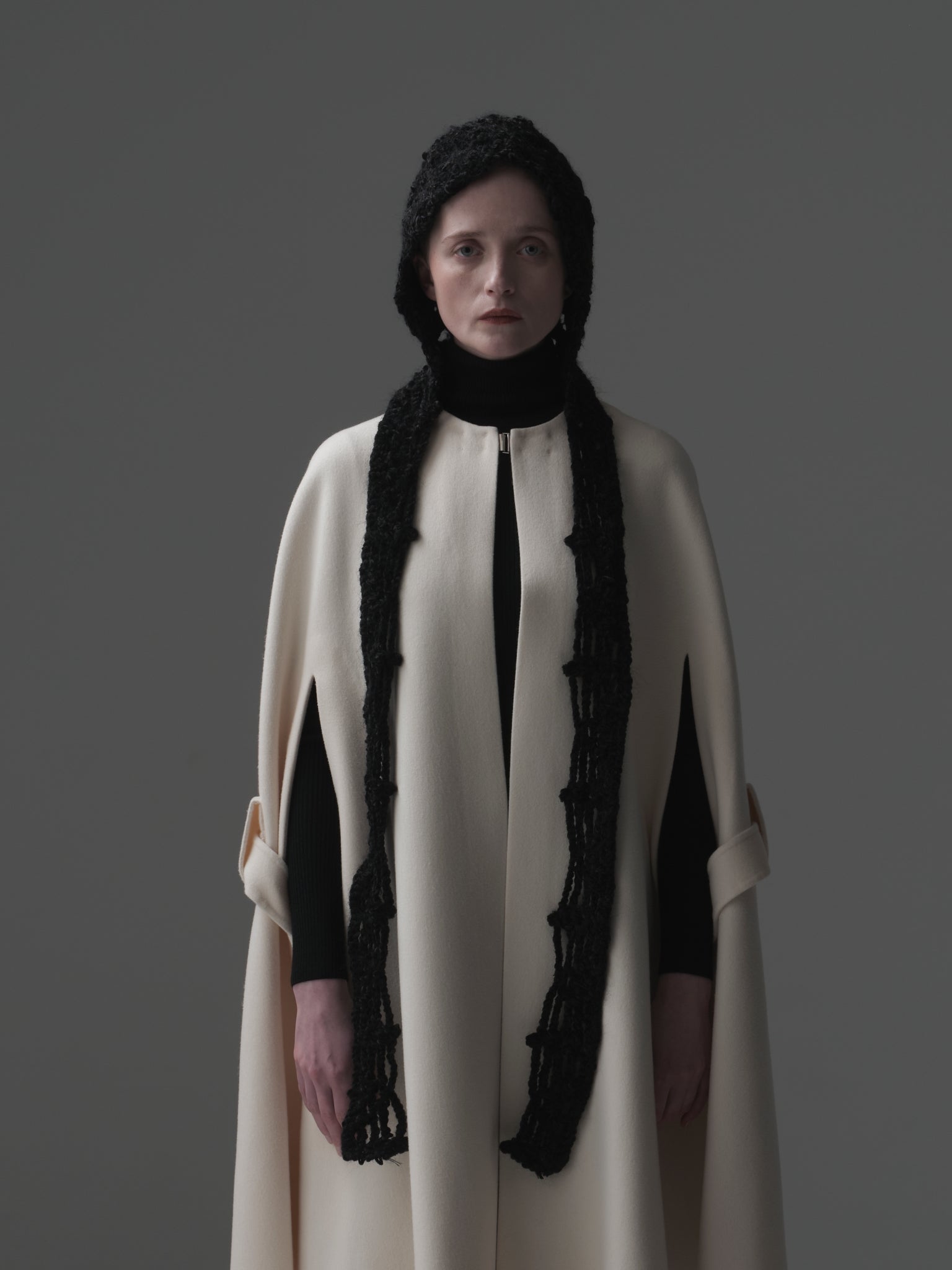 4つのカギ編みモチーフを⼀つ⼀つハンドメイドで繋ぎあわせる事でフォルムを作る、Alexandraシリーズ。今季はモール⽷を使って⽴体感のあるフォルムとボリュームを出しました。モール⽷とモヘアが上品な光沢感とボリューム感を。モチーフの柄が絶妙なバランスを⽣み出しています。