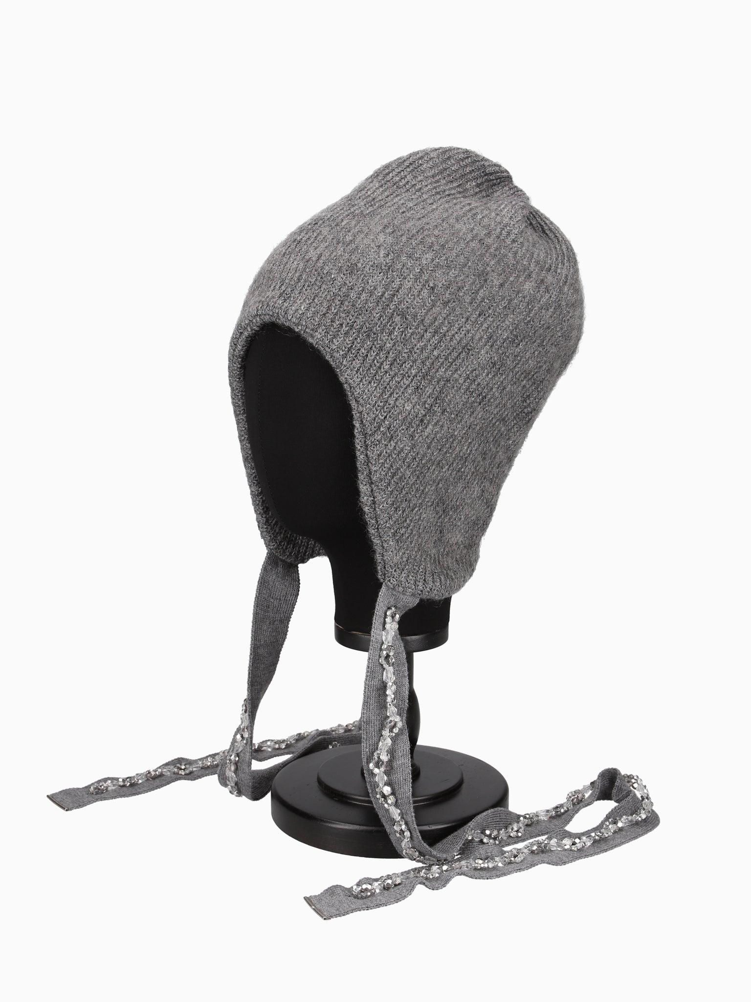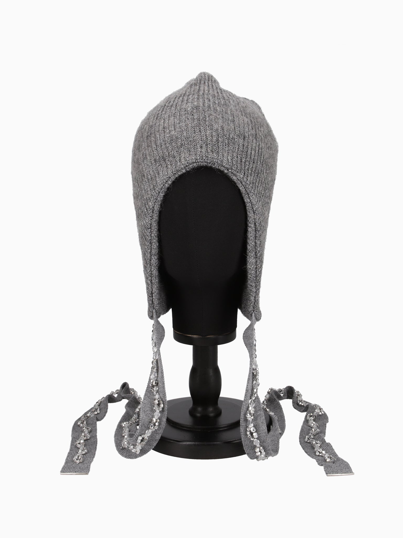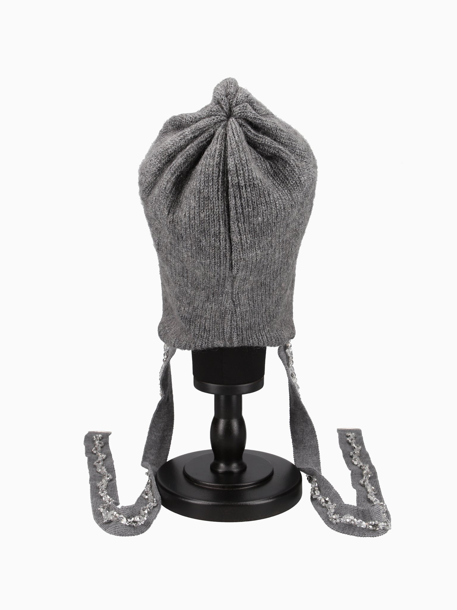心地よい肌ざわりにこだわった上質な糸を使用した、ニットキャップです。耳まで暖かなフォルムは新型となっています。キュビズムを連想する多角形のチェコ製のビジューを使用し、垂れるニットリボンの部分にあしらいました。シンプルでカジュアルさもあるデザインの中にビジューをふんだんにあしらう事でラグジュアリーな存在感のあるニットキャップになっています。
