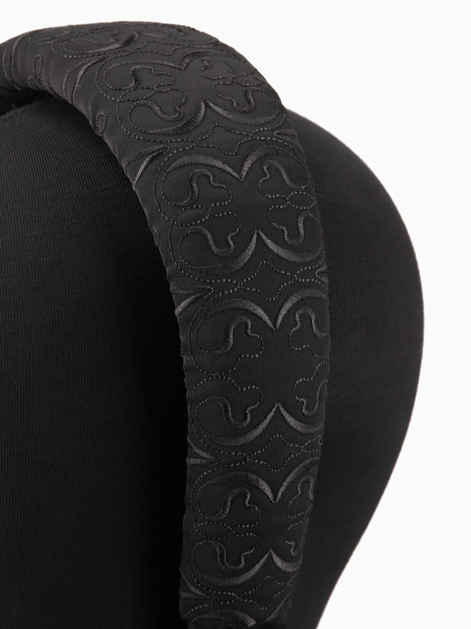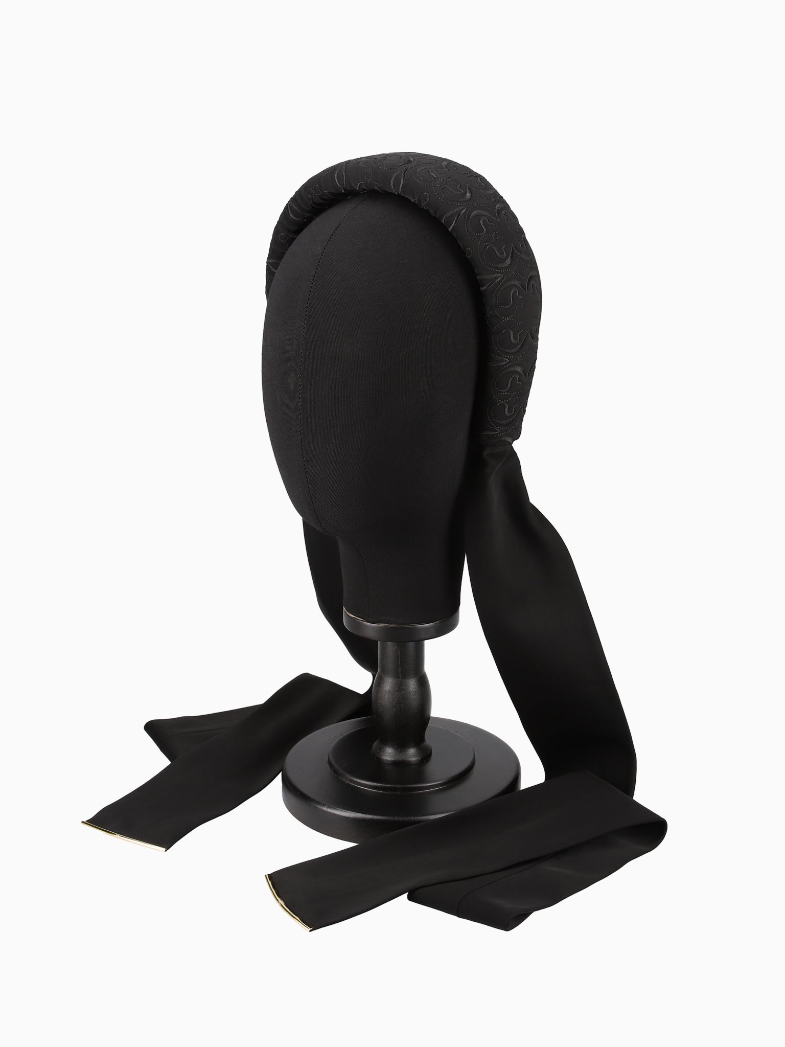 キュビズム建築のレリーフをイメージした柄を作り、古くは着物の帯に美しい刺繍を施していた背景をもつ工場で繊細な刺繍で作るキルティング地をオリジナルでオーダーしています。クラシカルなカチューシャにあしらい、直線的でモダンなリボンをアレンジして洋服に溶け込ます事の出来るシンプルな中にも存在感のあるデザインに仕上げました。