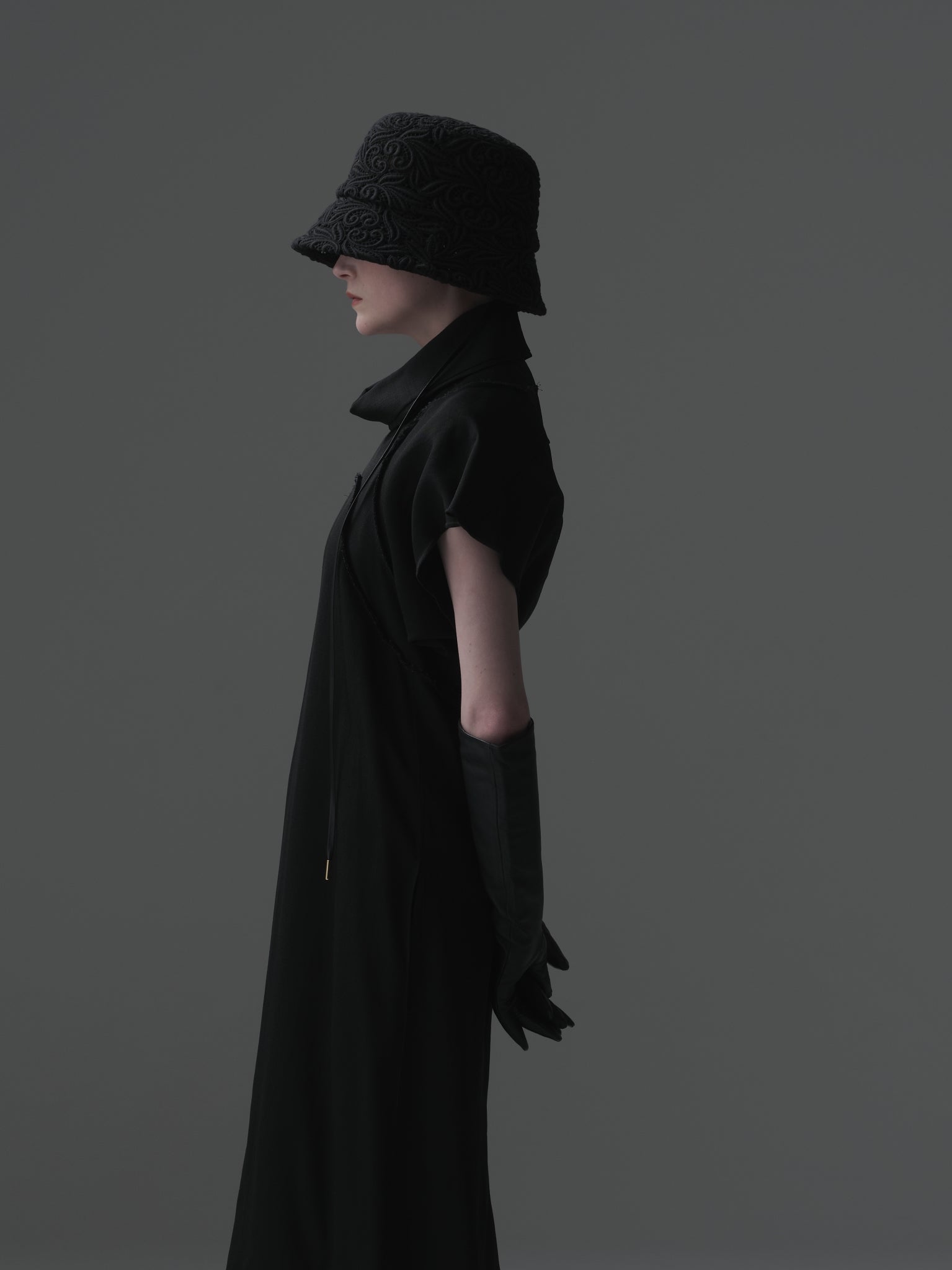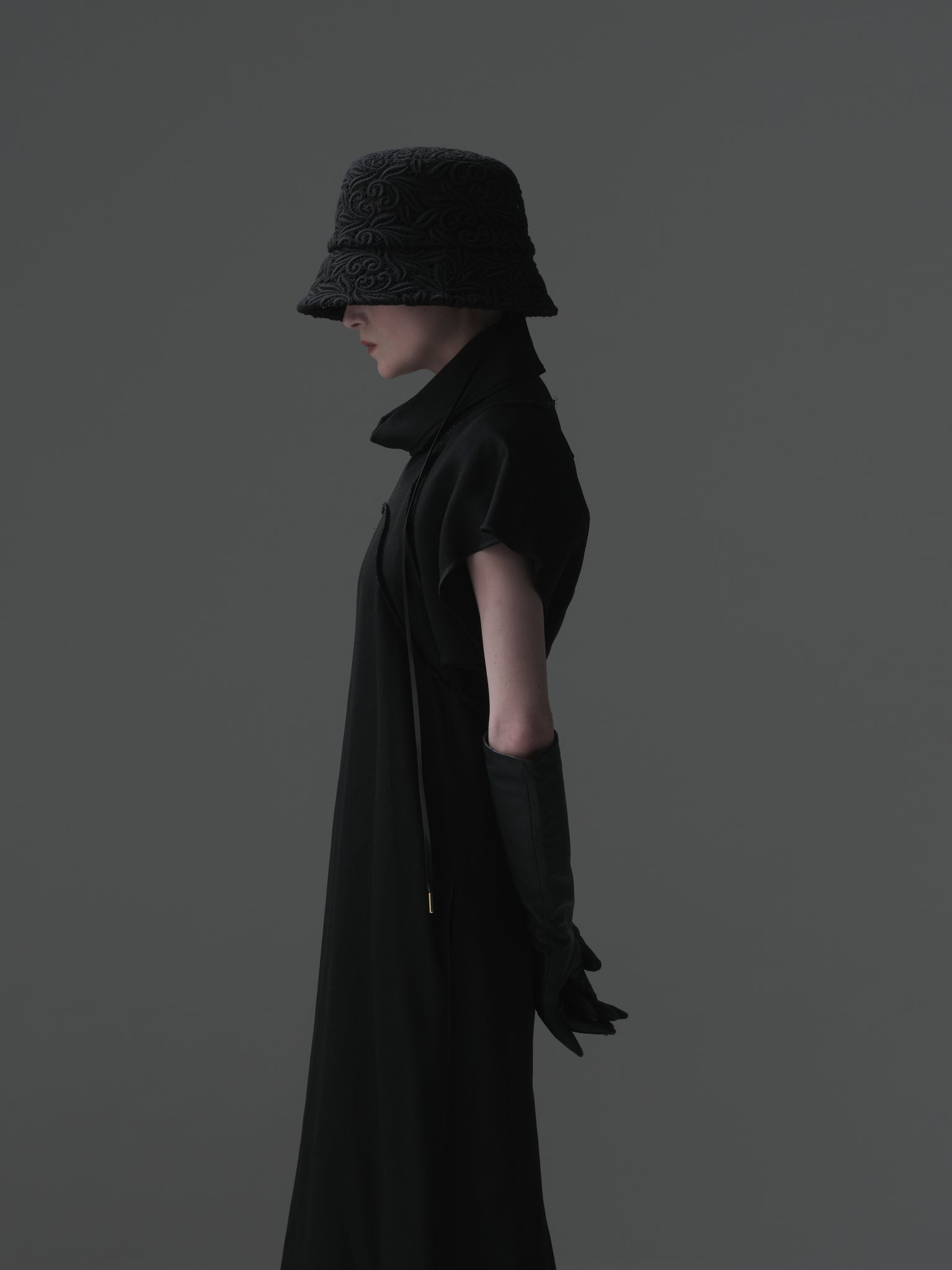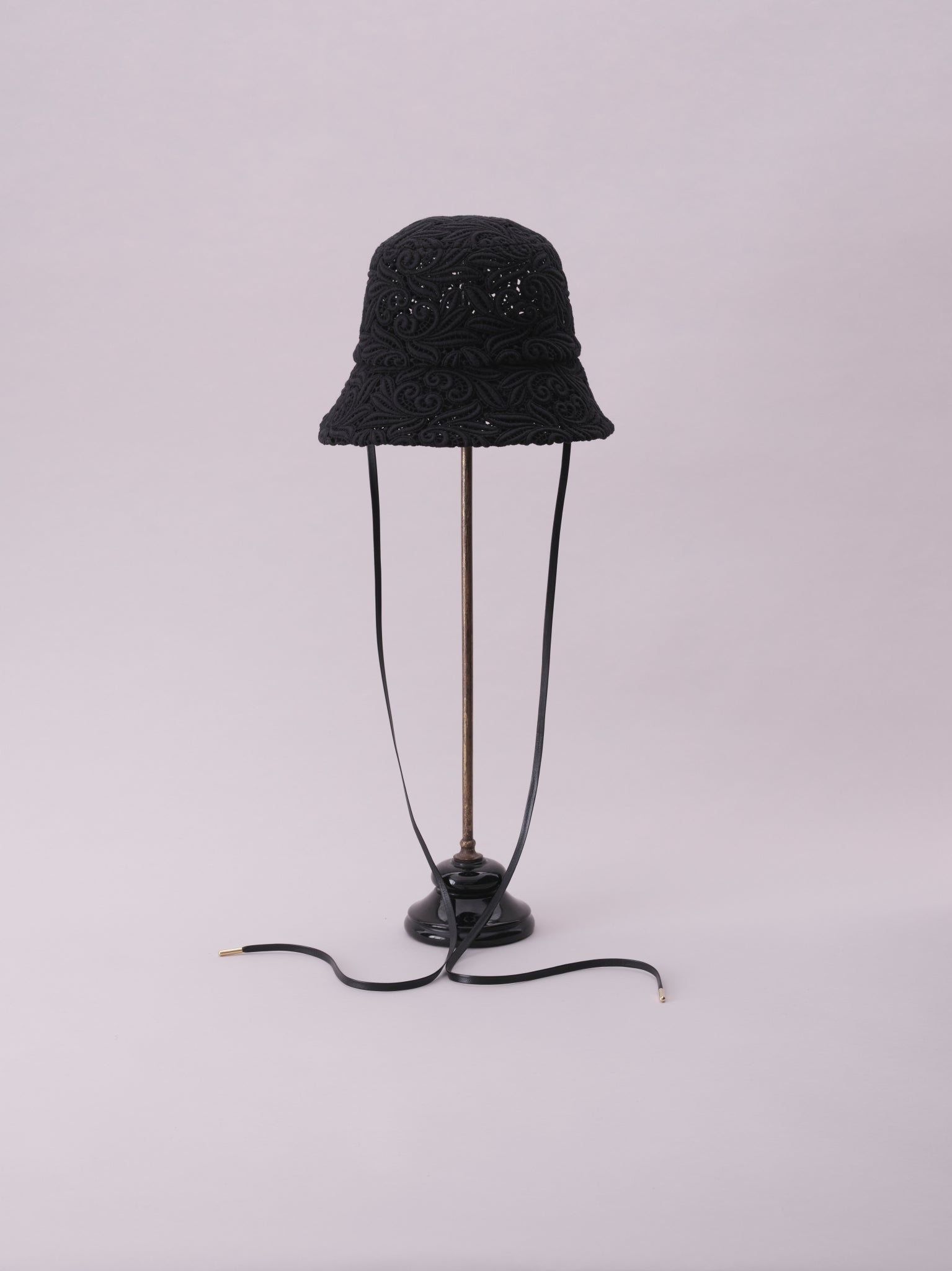 ボリュームのあるラグジュアリーなケミカルレースを縫製し、芯を使わず丁寧に一つ一つ型入れして仕上げた、ハットはまるでクチュールのようです。レースの透け感が落とす影にラグジュアリーさが漂っ ています。リボン自体も取り外し可能なので気分に合わせてハットのみの使用も可能です