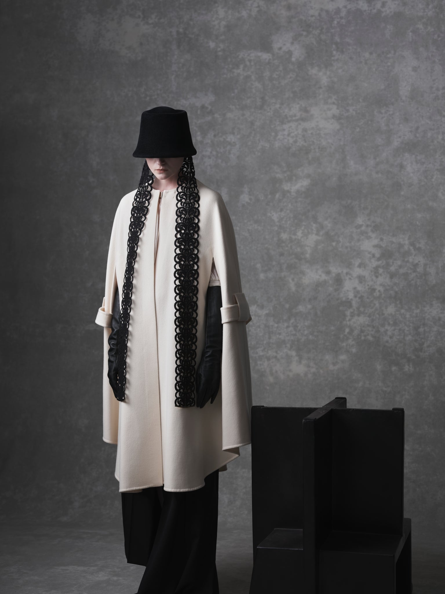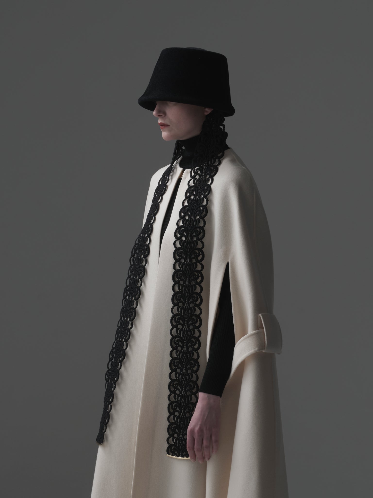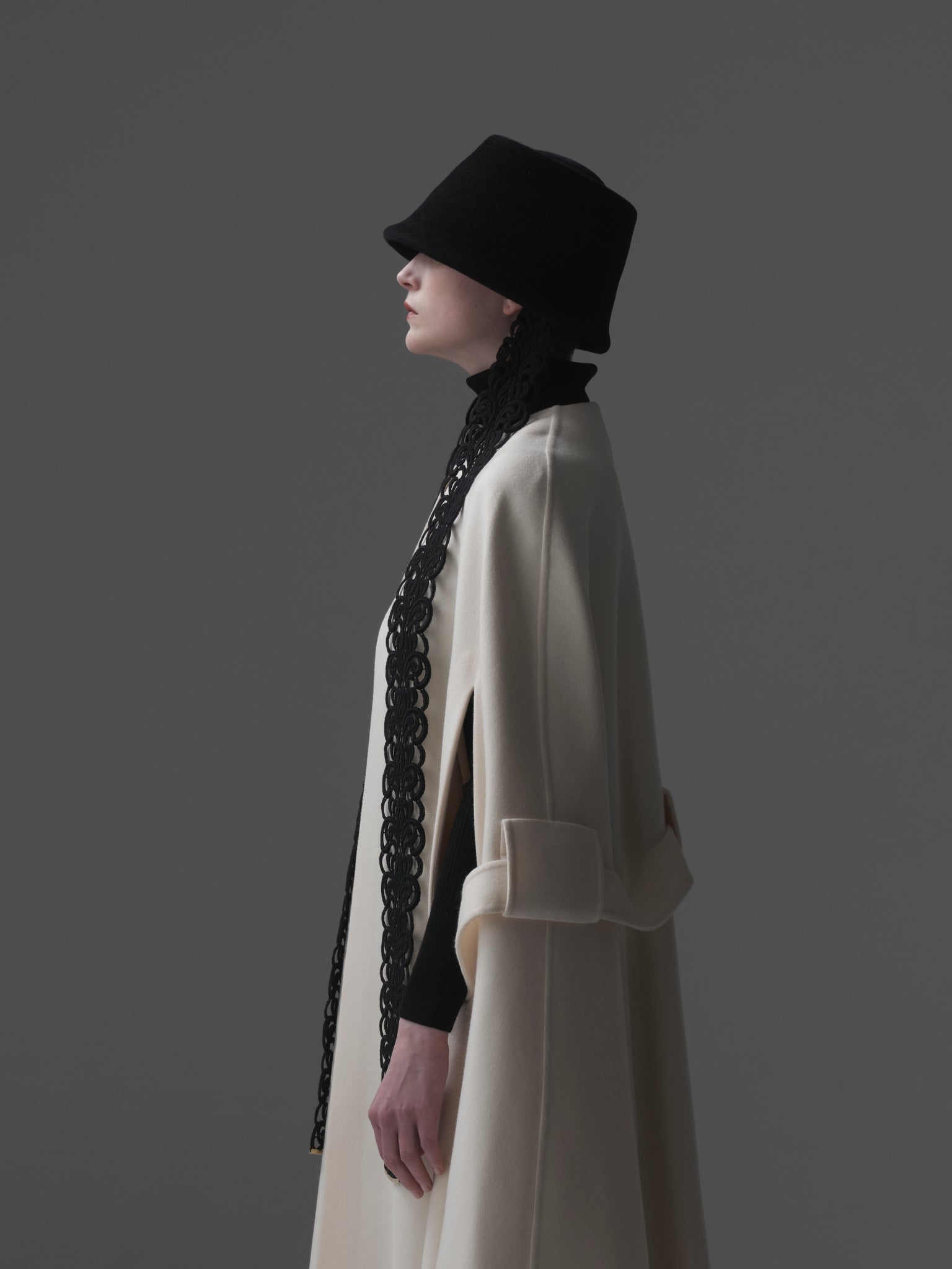 本体はラビットフェルトを使⽤しています。表⾯は微起⽑しており、肌触りはラグジュアリーなベロア タッチです。 附属のレースのリボンはエントランスのアプローチをイメージしケミカルレースという⼿法で表⾒しま した。リボン⾃体も取り外し可能なので気分に合わせてハ ットのみの使⽤も可能です。