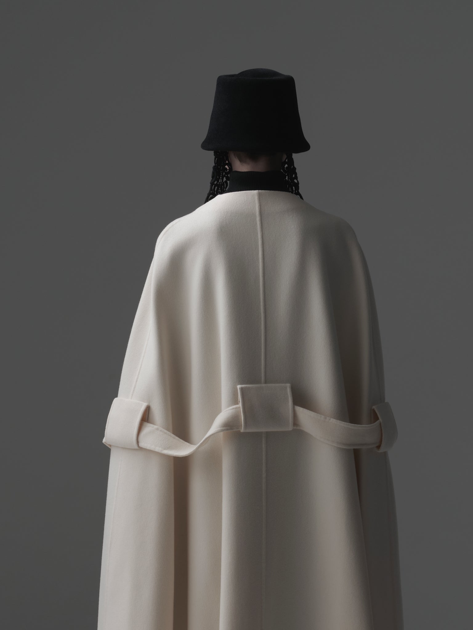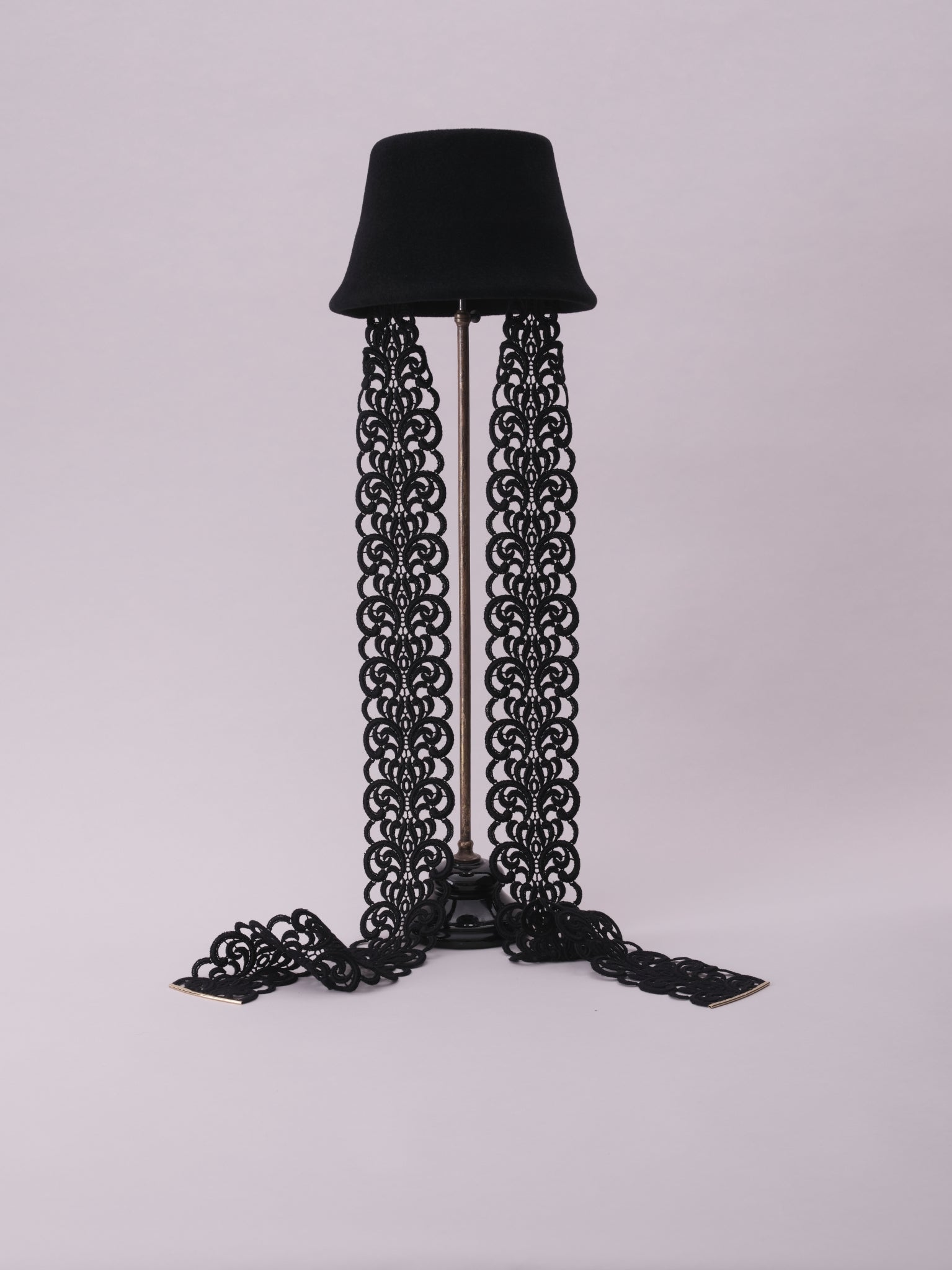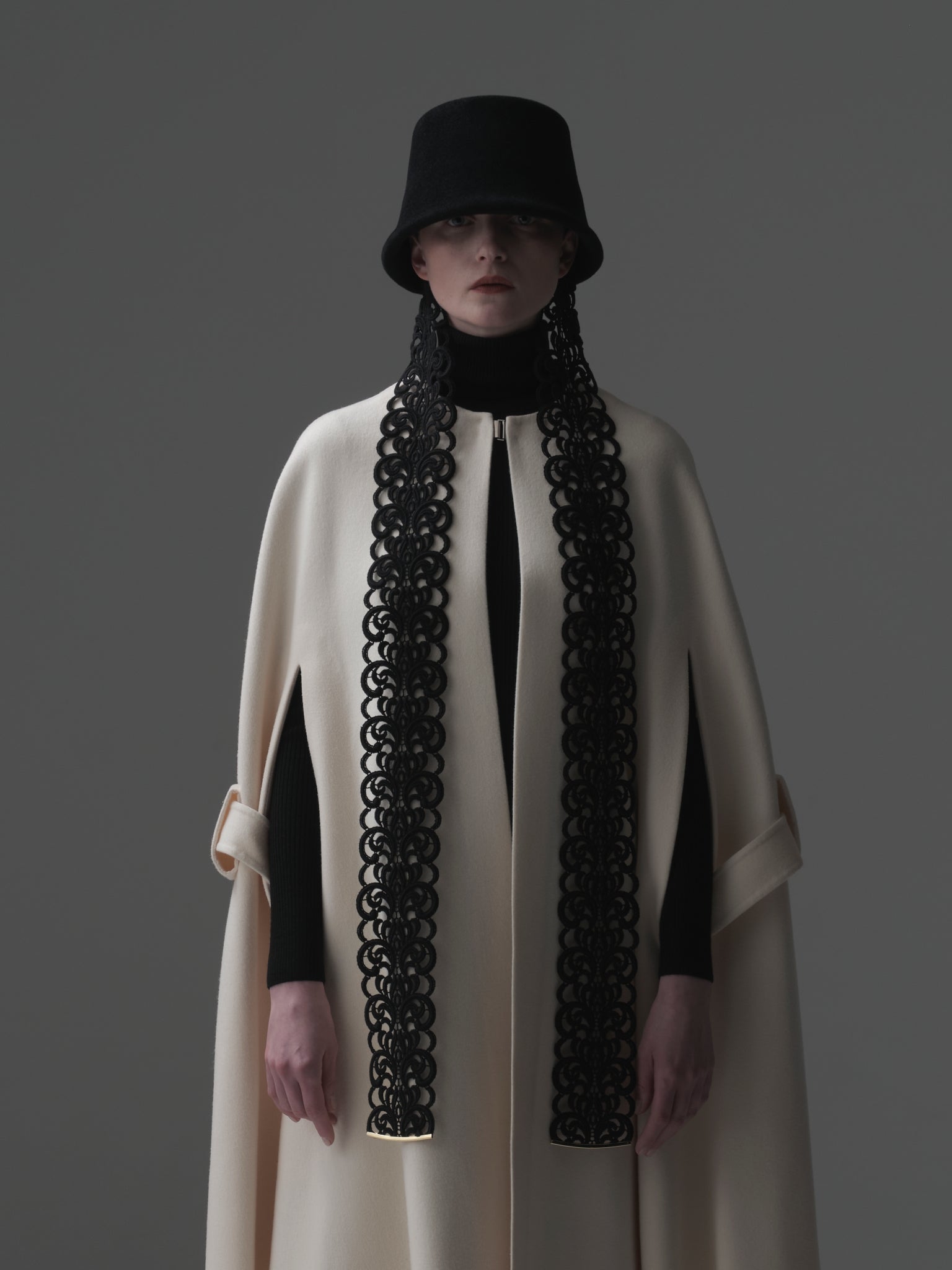 本体はラビットフェルトを使⽤しています。表⾯は微起⽑しており、肌触りはラグジュアリーなベロア タッチです。 附属のレースのリボンはエントランスのアプローチをイメージしケミカルレースという⼿法で表⾒しま した。リボン⾃体も取り外し可能なので気分に合わせてハ ットのみの使⽤も可能です。