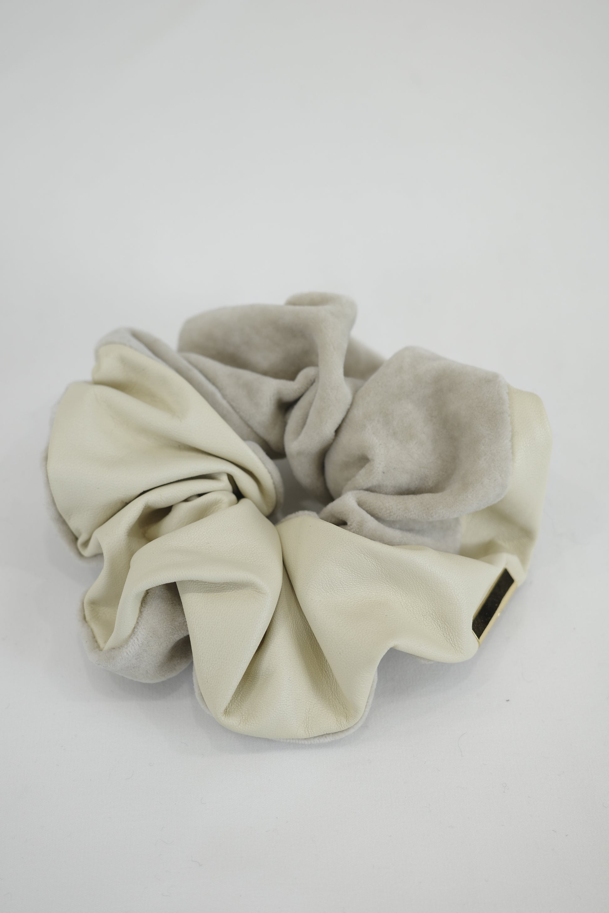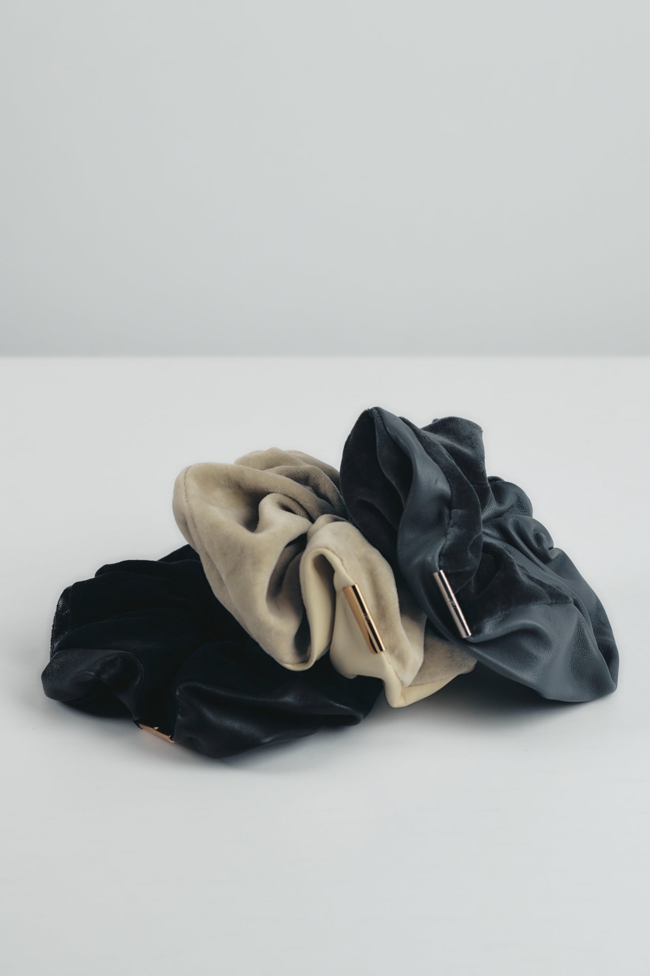上質なベルベットとレザーのコンビがクールな印象の、大人の女性のためのシュシュ。