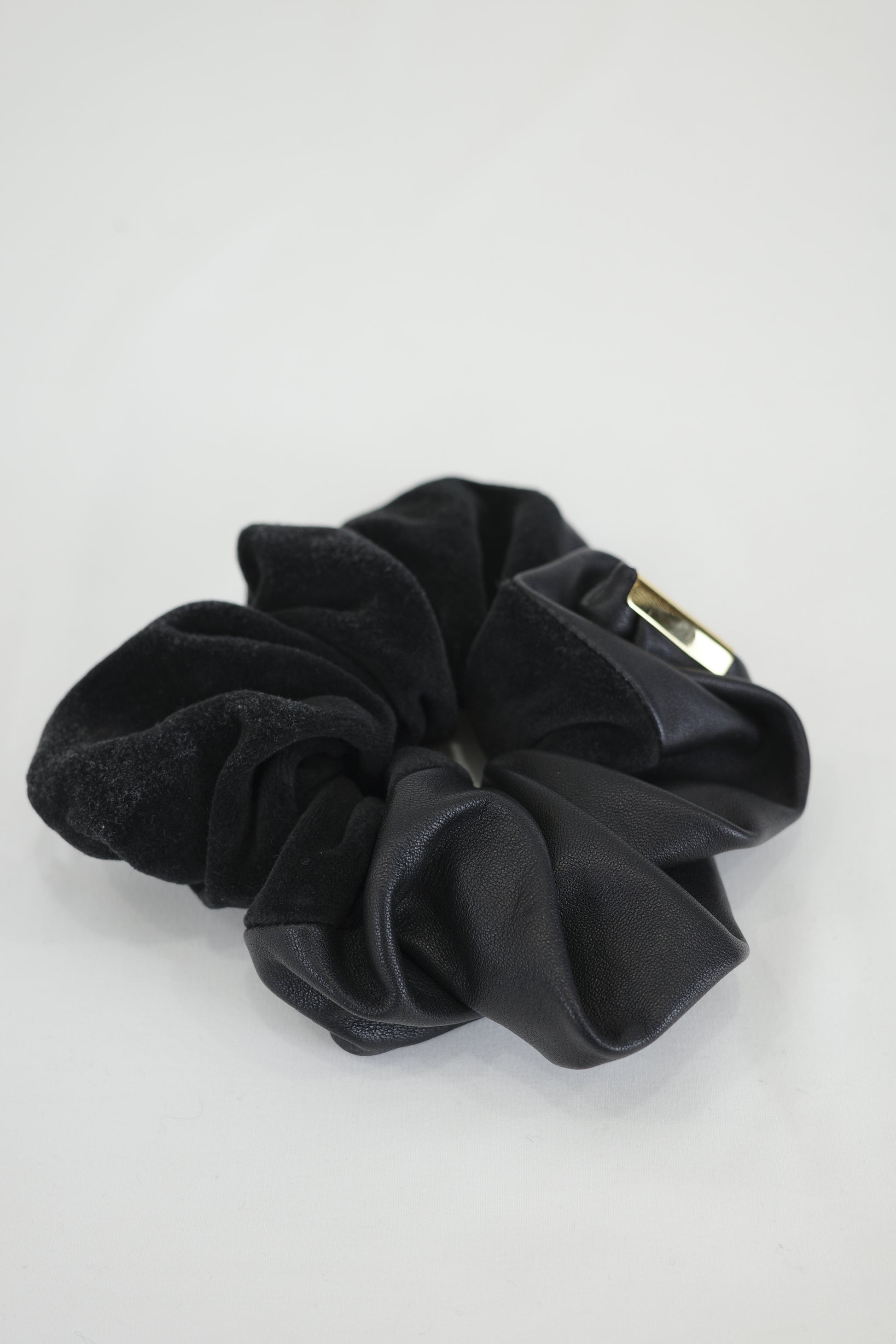 上質なベルベットとレザーのコンビがクールな印象の、大人の女性のためのシュシュ。