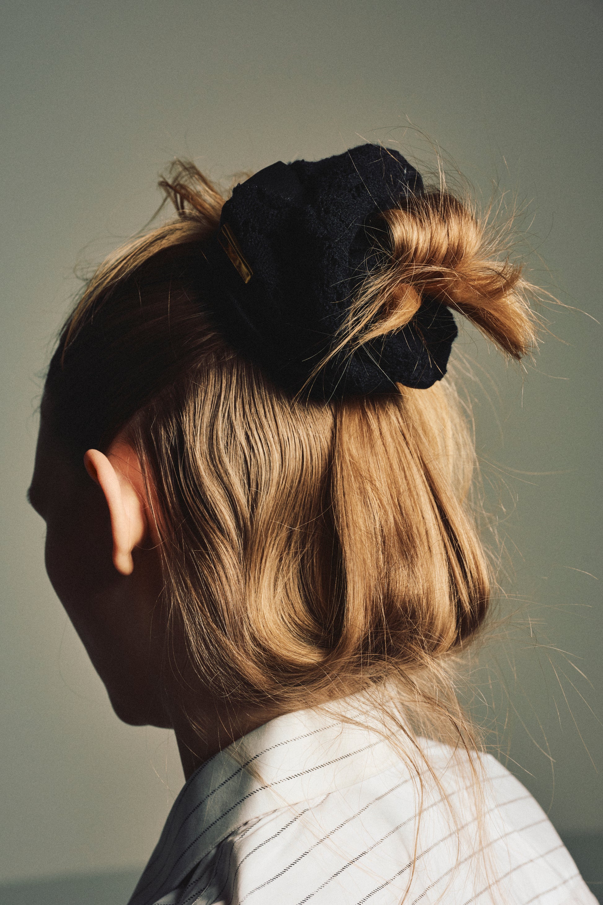 繊細なレースにレザーを組み合わせることで、甘さを引き算したクールな印象のシュシュ。