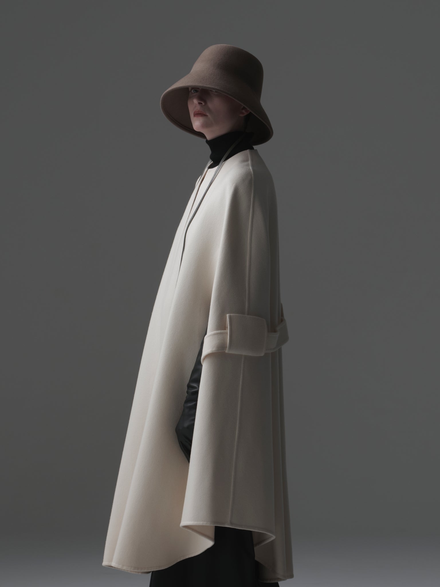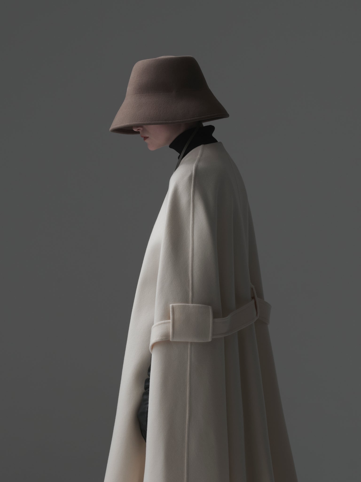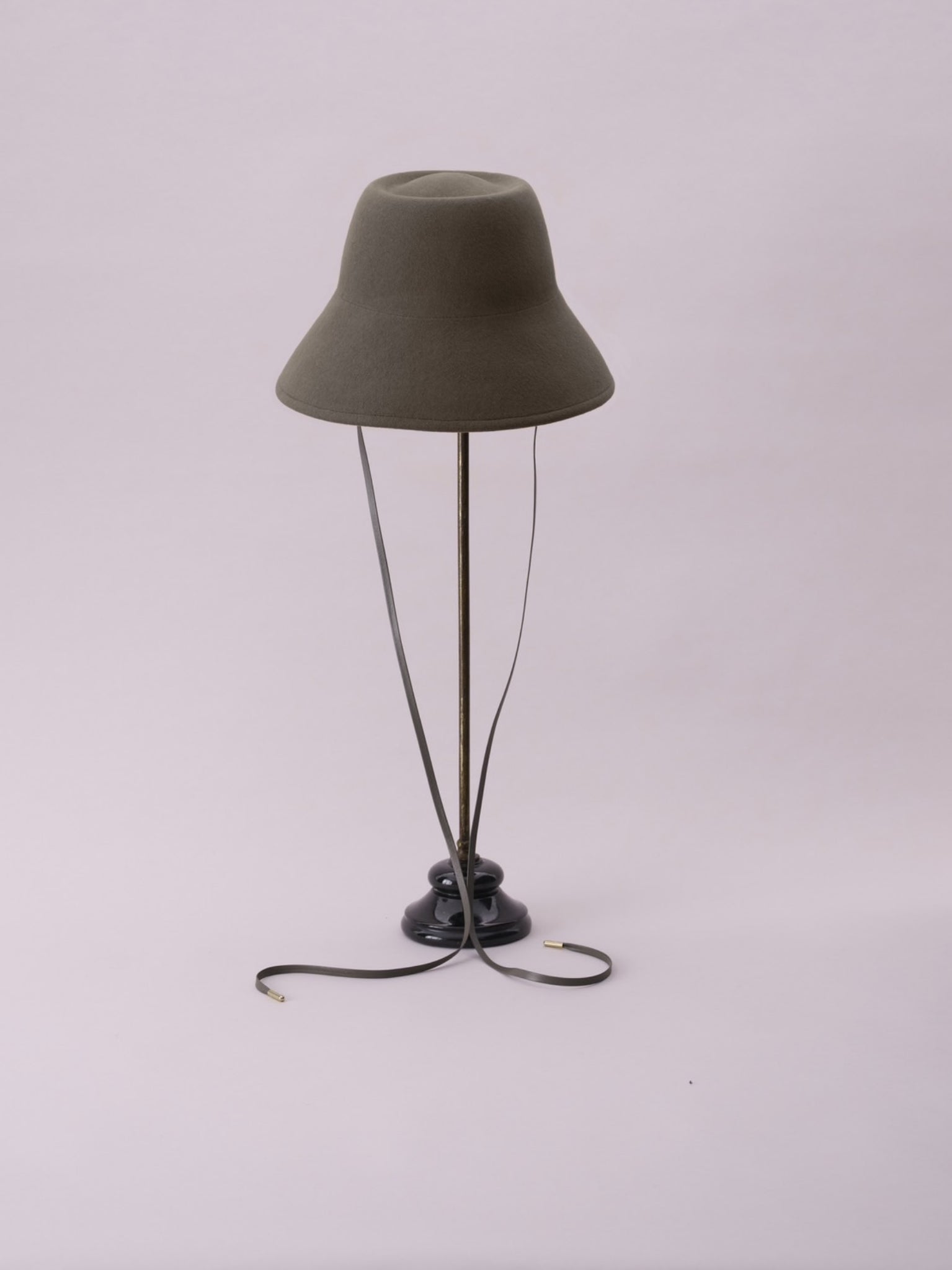 定番商品のメリノウール100%のクロッシェ帽子。100年以上前のアンティークを元にオリジナルの木型を作成し、シンプルかつモダンなデザインに落とし込みました。カジュアルすぎず、モードにも被れる大人の女性に向けたバケット型になっています。ドローコードは取り外しが可能。