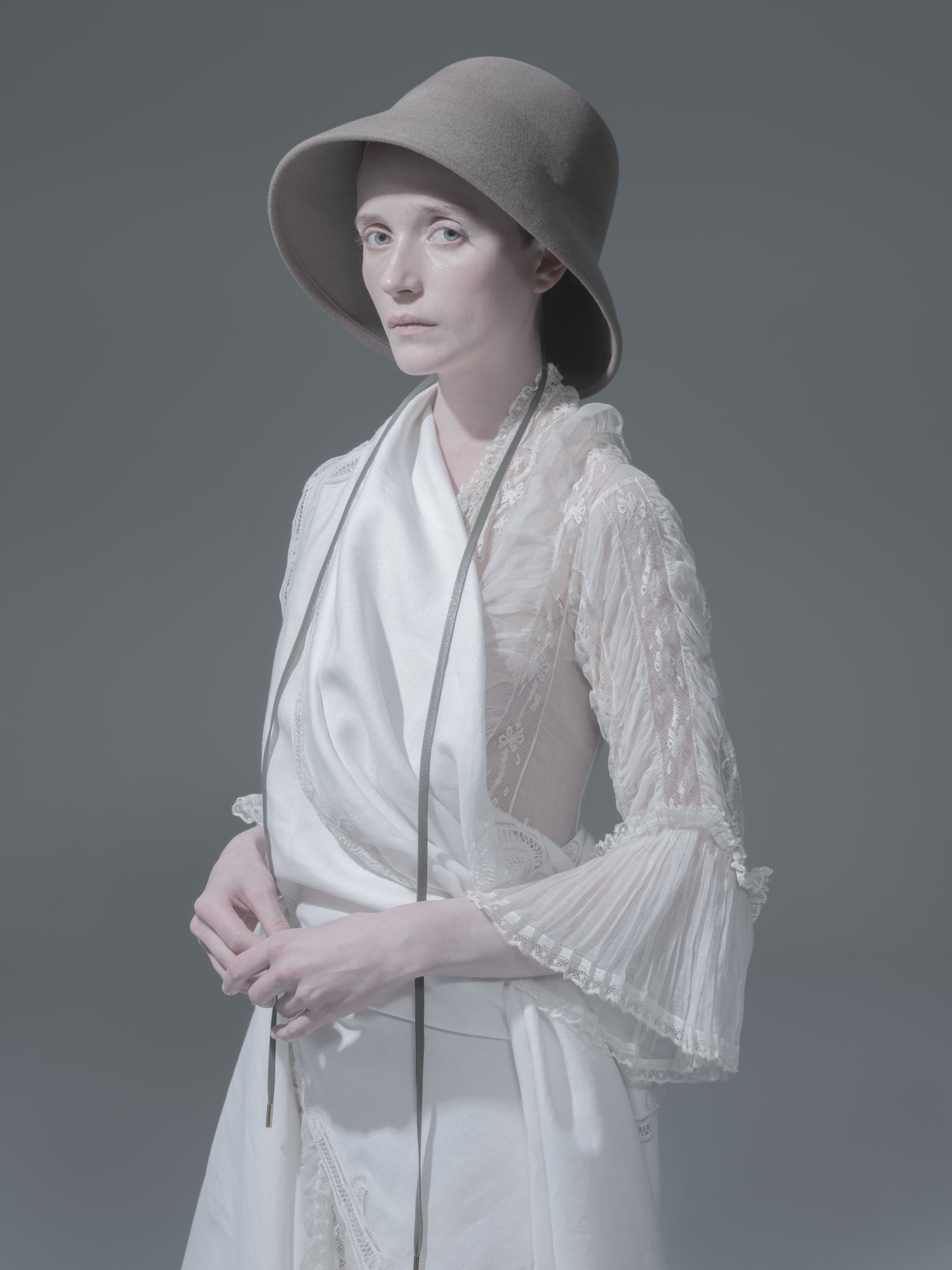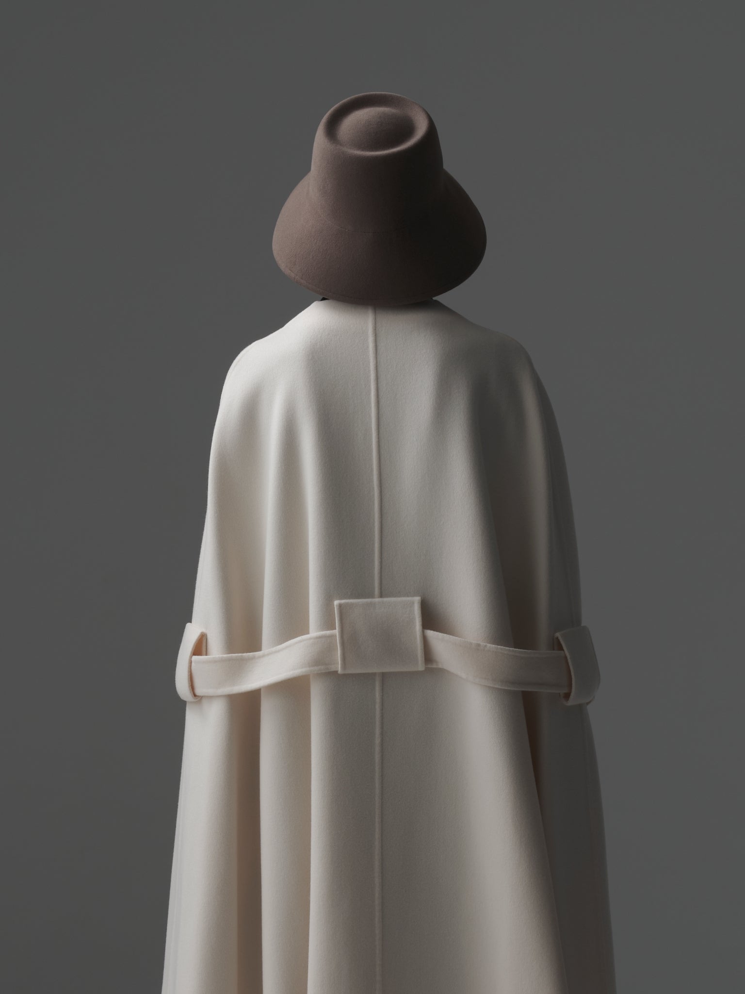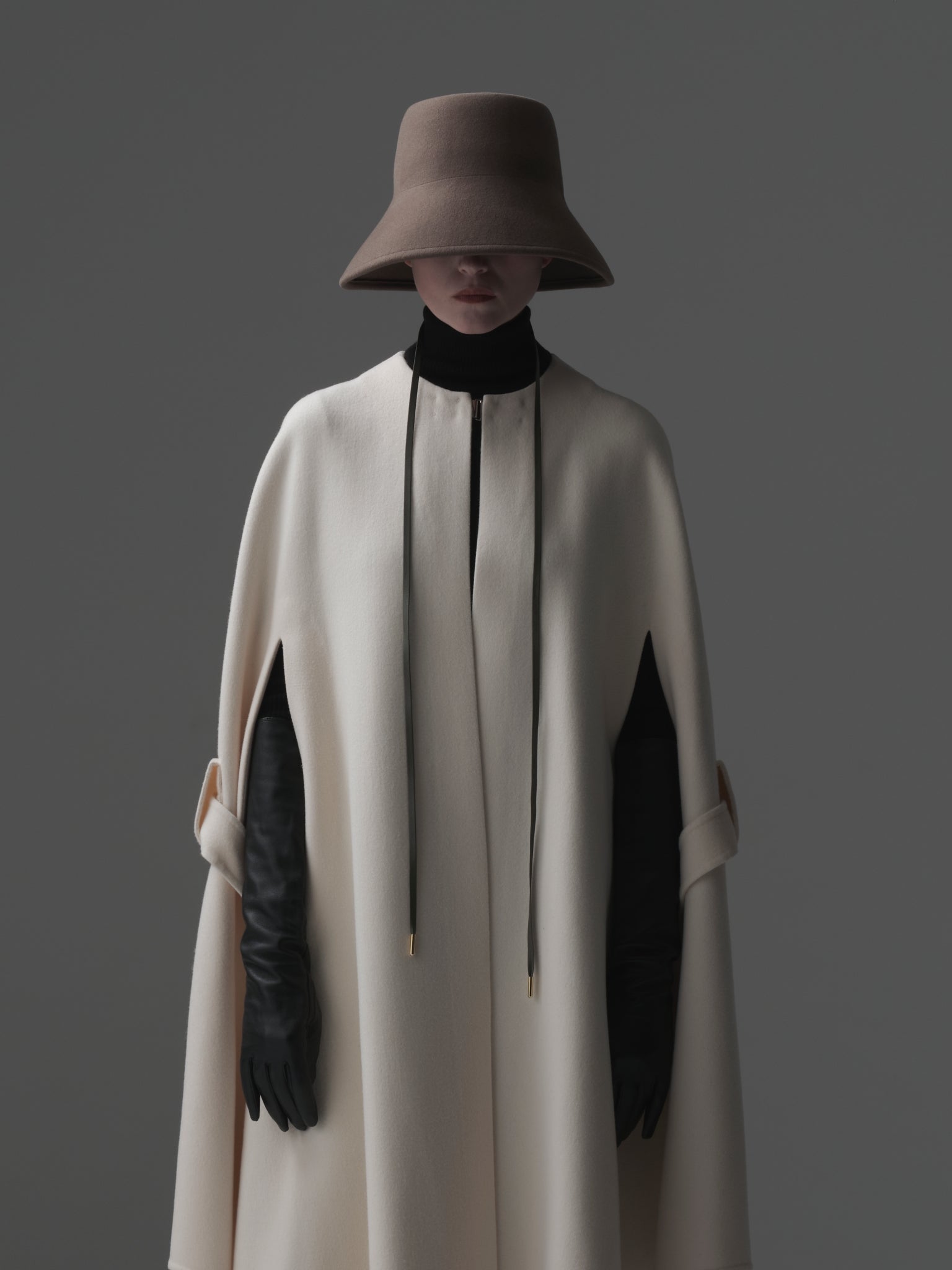 定番商品のメリノウール100%のクロッシェ帽子。100年以上前のアンティークを元にオリジナルの木型を作成し、シンプルかつモダンなデザインに落とし込みました。カジュアルすぎず、モードにも被れる大人の女性に向けたバケット型になっています。ドローコードは取り外しが可能。