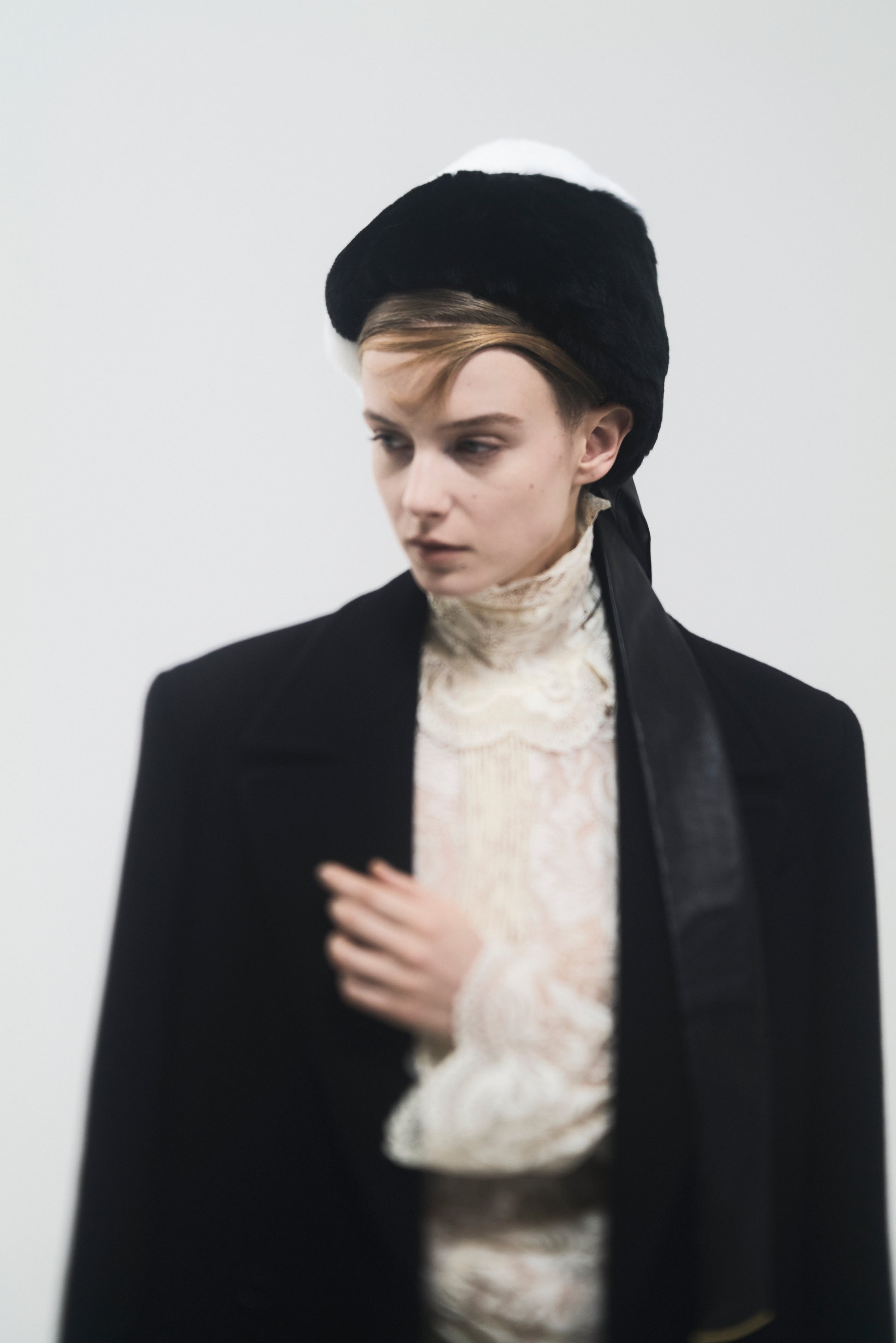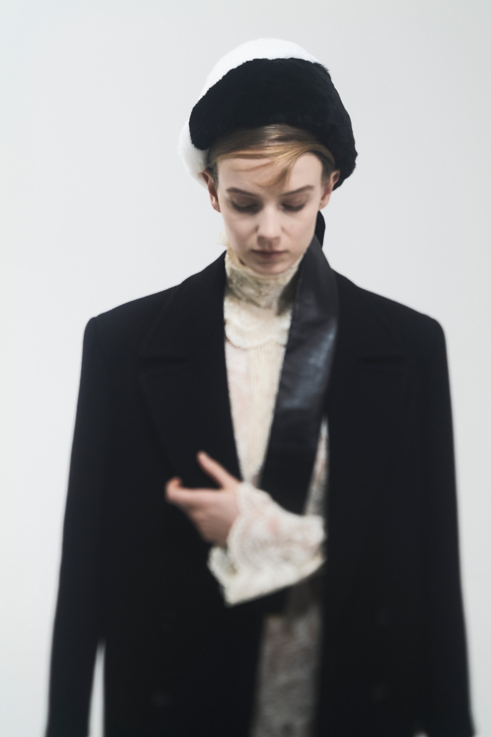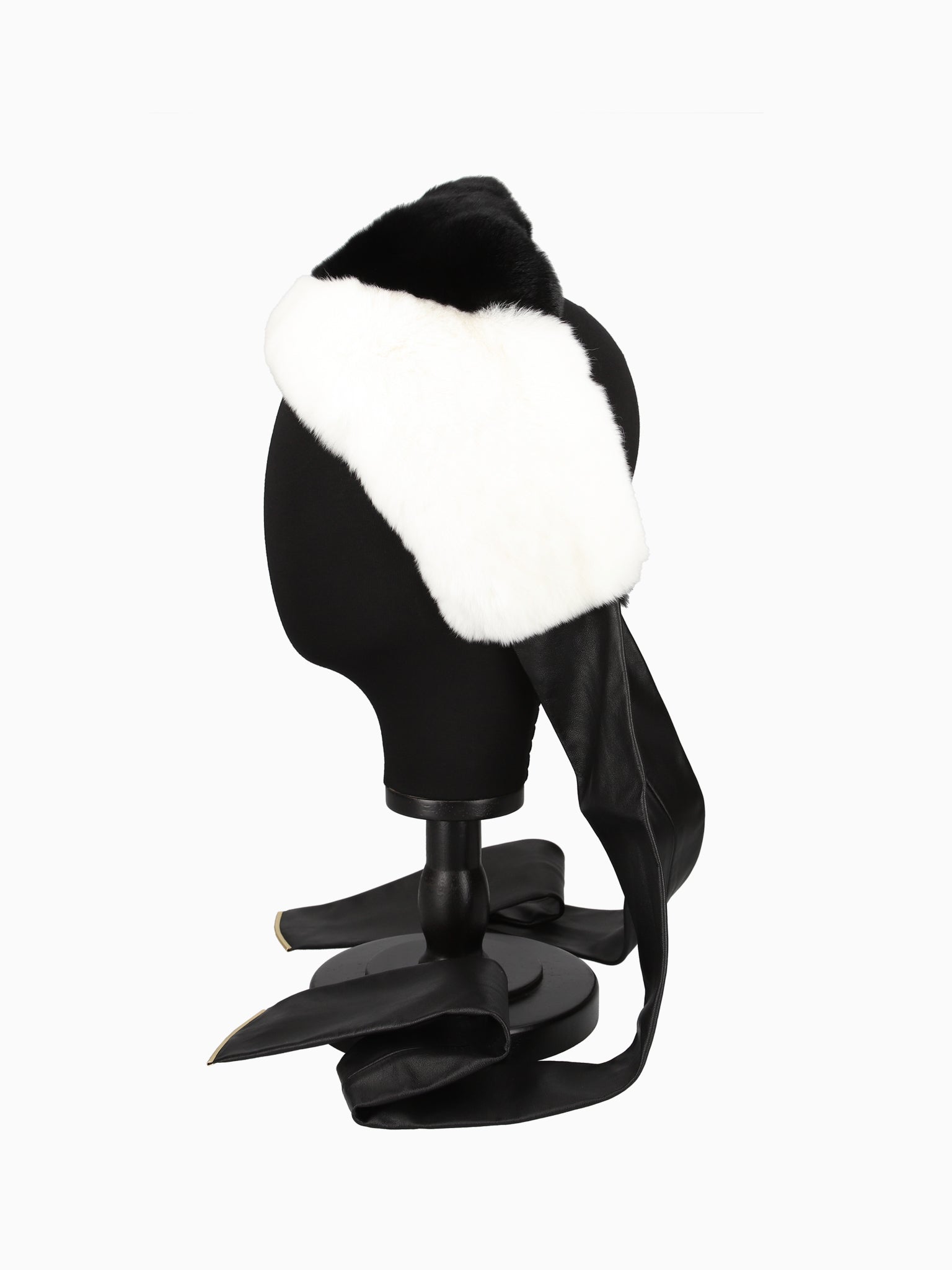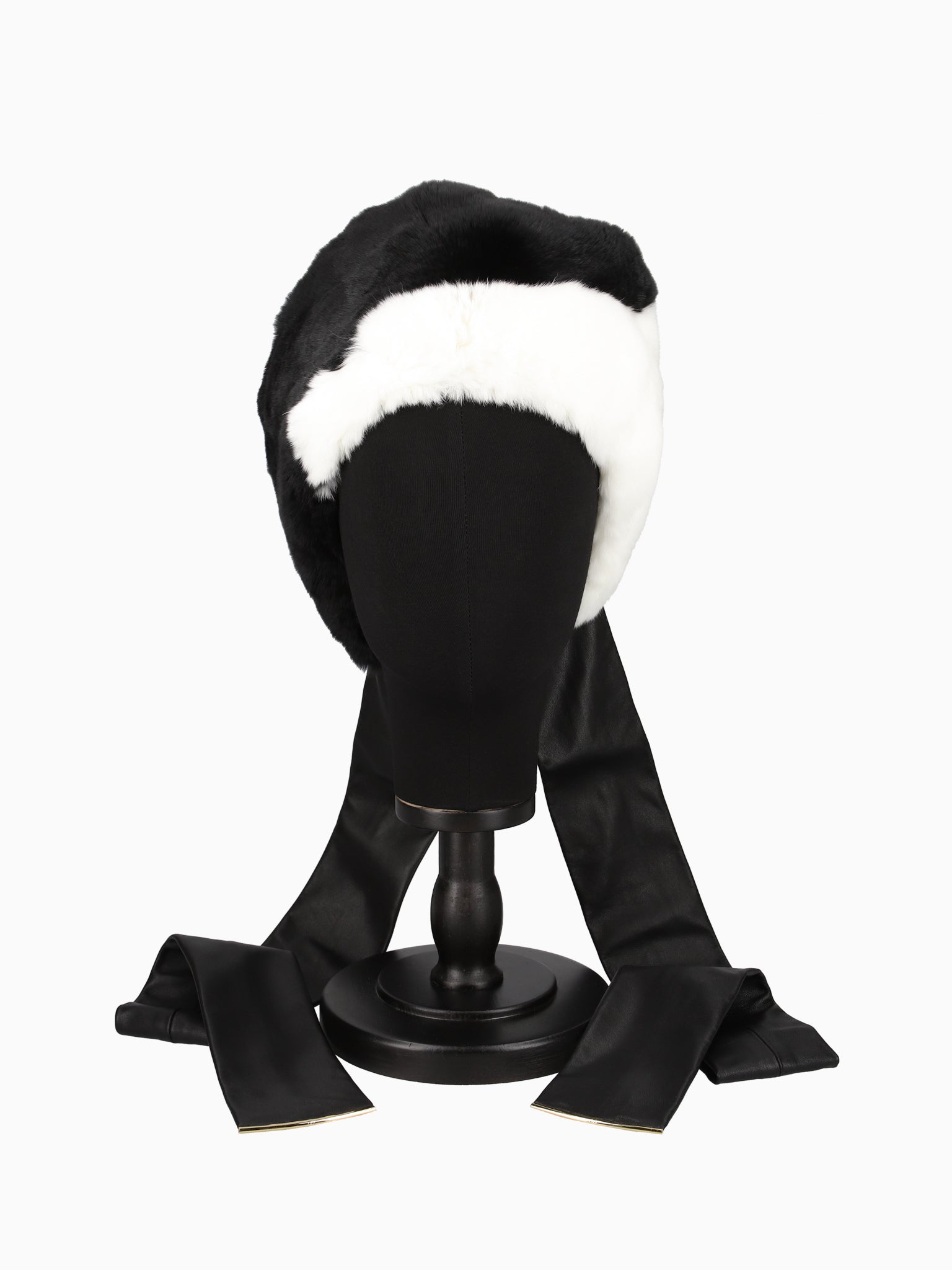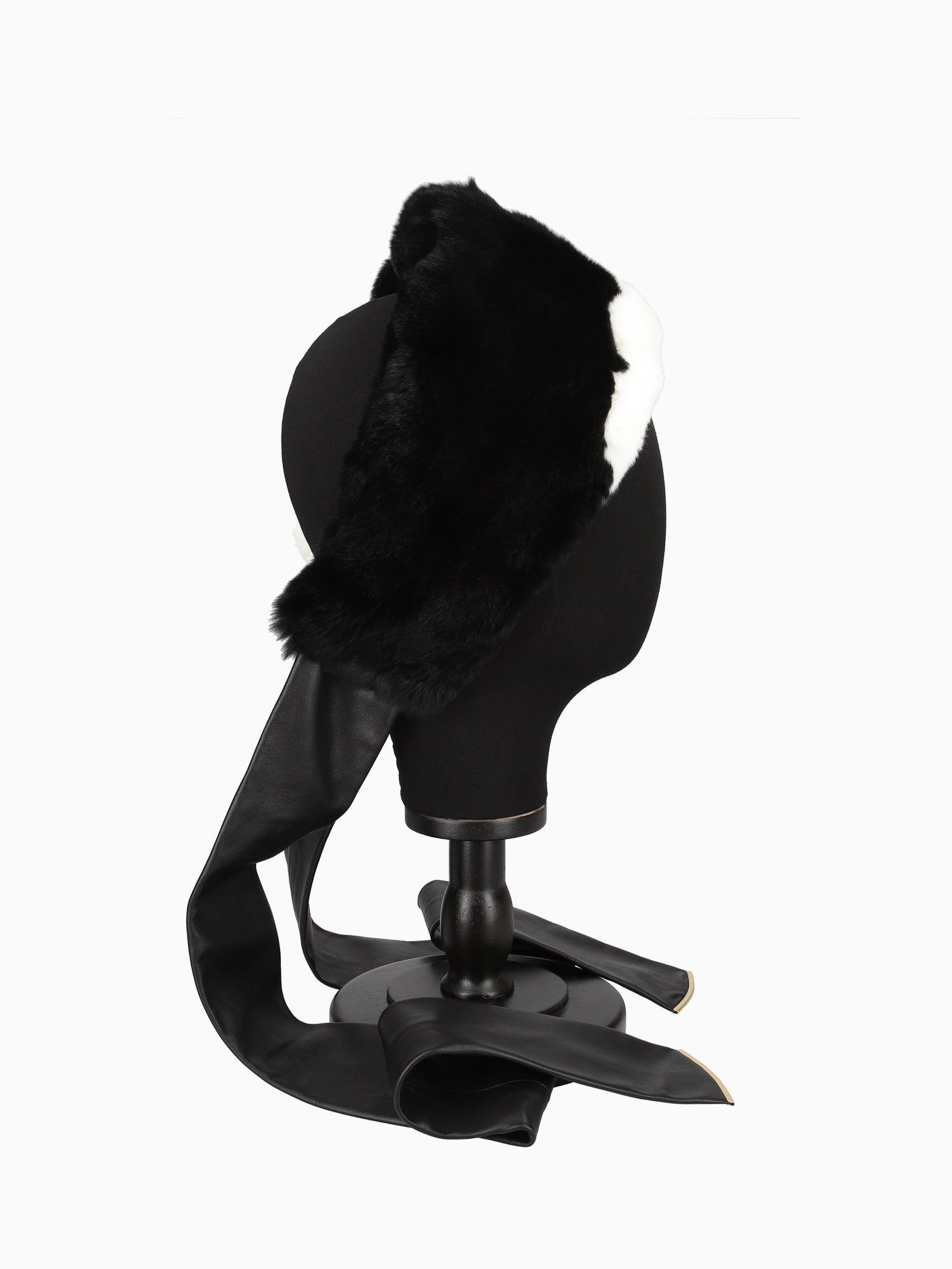 クラシカルなファーのトークをイメージし、アレンジしたフォルムになります。ヘッドバンドの作りなので、フィット感もとても良く、柔らかなラムレザーのリボンでアレンジが可能です。レッキスというとても柔らかいラビットファーの品種のデットストックを使用しています。昨今リアルファーは捨てられてしまうという背景もあり、ブランドではデットストックで良い品質の物がある限り、美しい形にしていきたいと思っています。