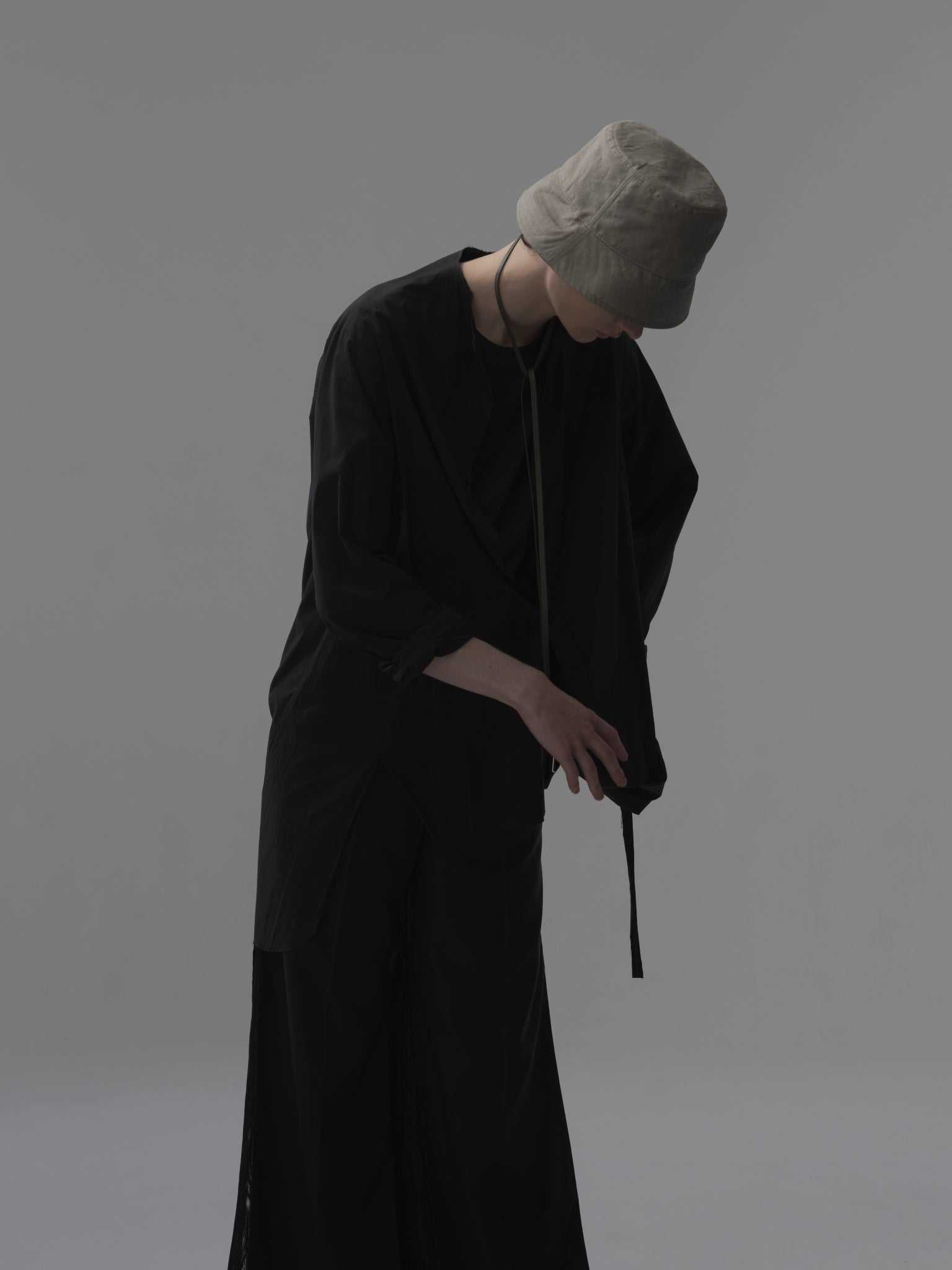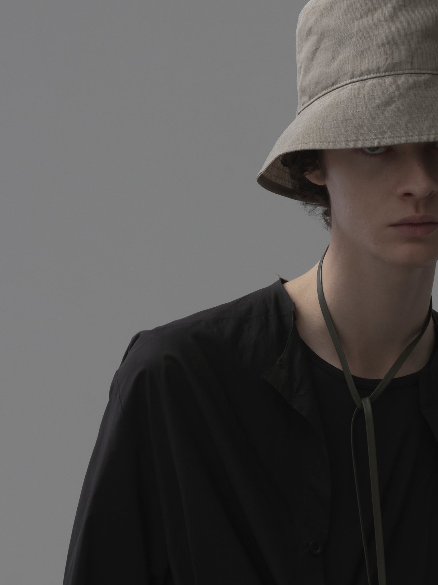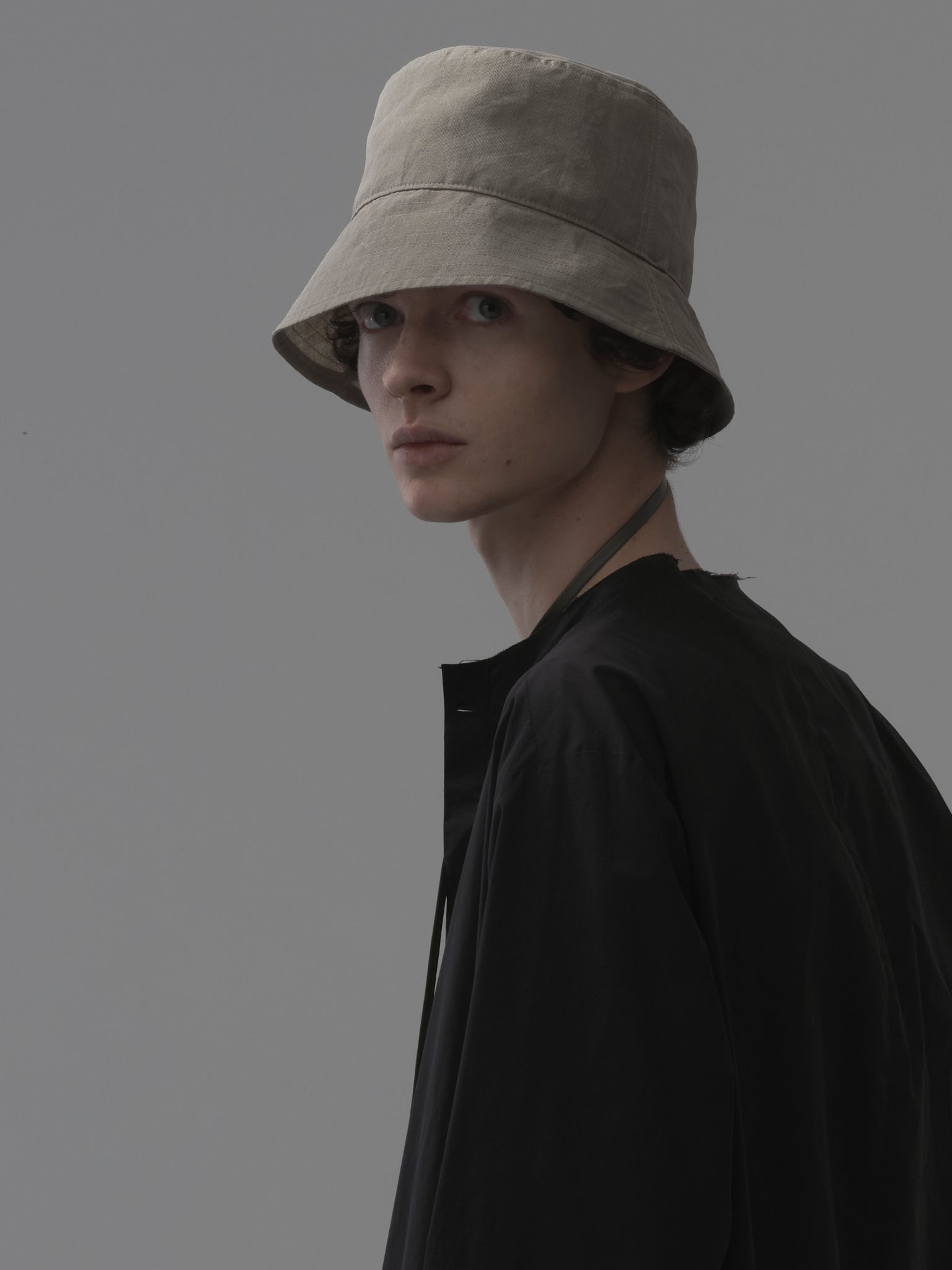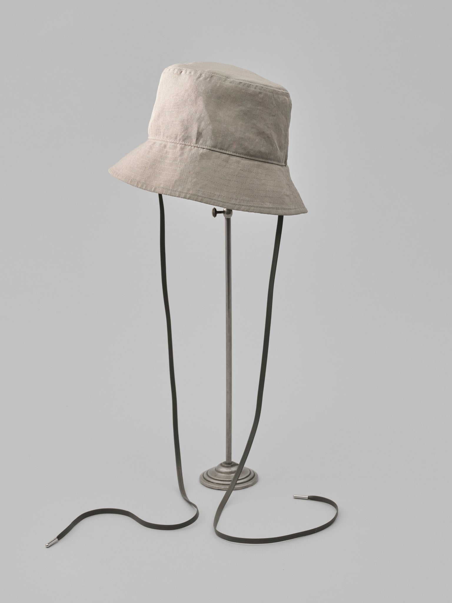 透け感があり、小さく畳めてとても軽く手洗いも可能なバケットハット。 生地はラミーの糸にこんにゃく糊でハリコシを出しているので、帽子の立体感が芯を使わず保てます。 国内にしかない希少価値のある技法で環境にも優しく半永久的に形が保たれます。 取り外し可能なレザーのドローコードのマットブラックがモードなスタイル。 お洗濯の際はコードを取り外し、お水で優しく手洗いし、形を整えて乾かして下さい。